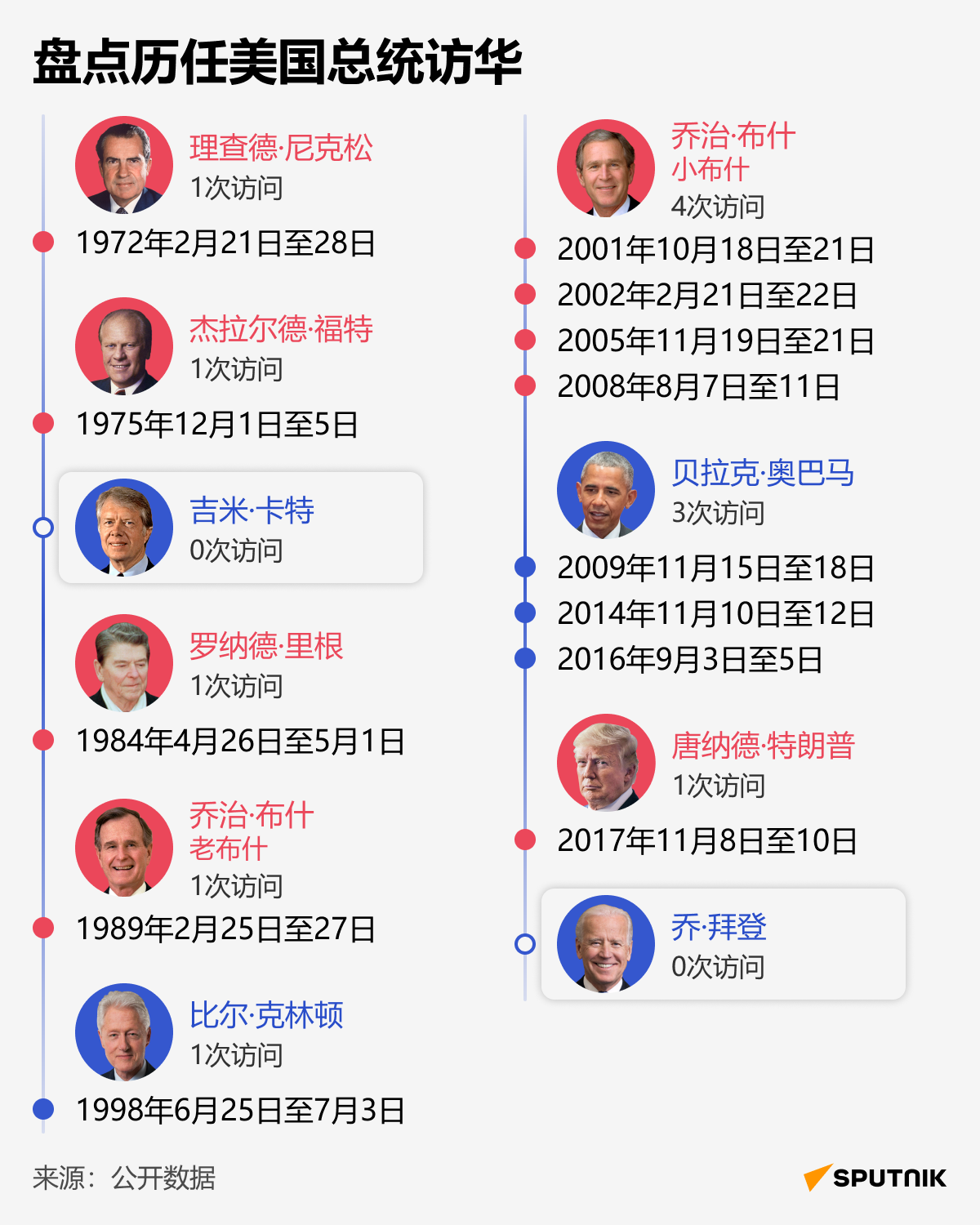 細(xì)心的俄羅斯衛(wèi)星通訊社盤點(diǎn)歷任美國(guó)總統(tǒng)訪華記錄,五十二年間10位中8位13次訪問(wèn)中國(guó)。