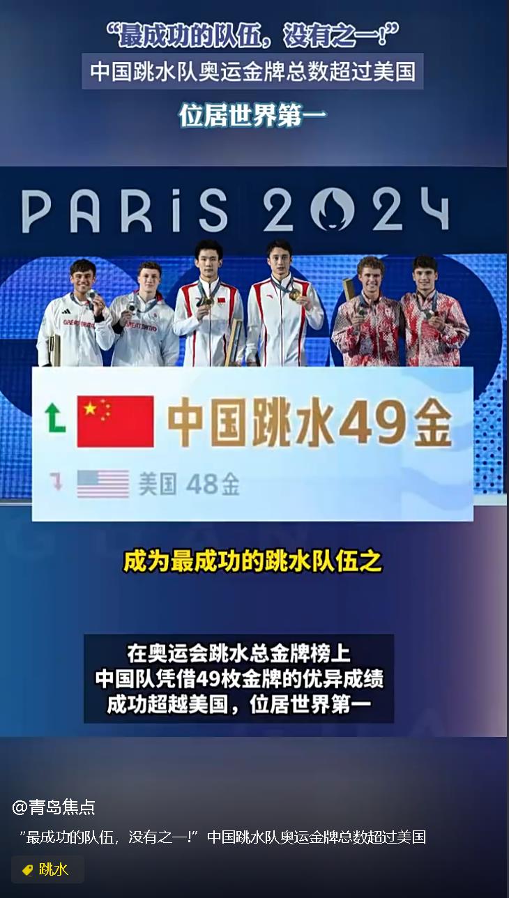 [中國(guó)跳水奧運(yùn)金牌總數(shù)已超美國(guó) 轉(zhuǎn)發(fā)!為中國(guó)健兒發(fā)條微博!] 今天,在奧運(yùn)會(huì)跳水總金牌榜上,中國(guó)跳水隊(duì)已獲49枚金牌,正式超越美國(guó)隊(duì)的48枚金牌。贊中國(guó)隊(duì)!