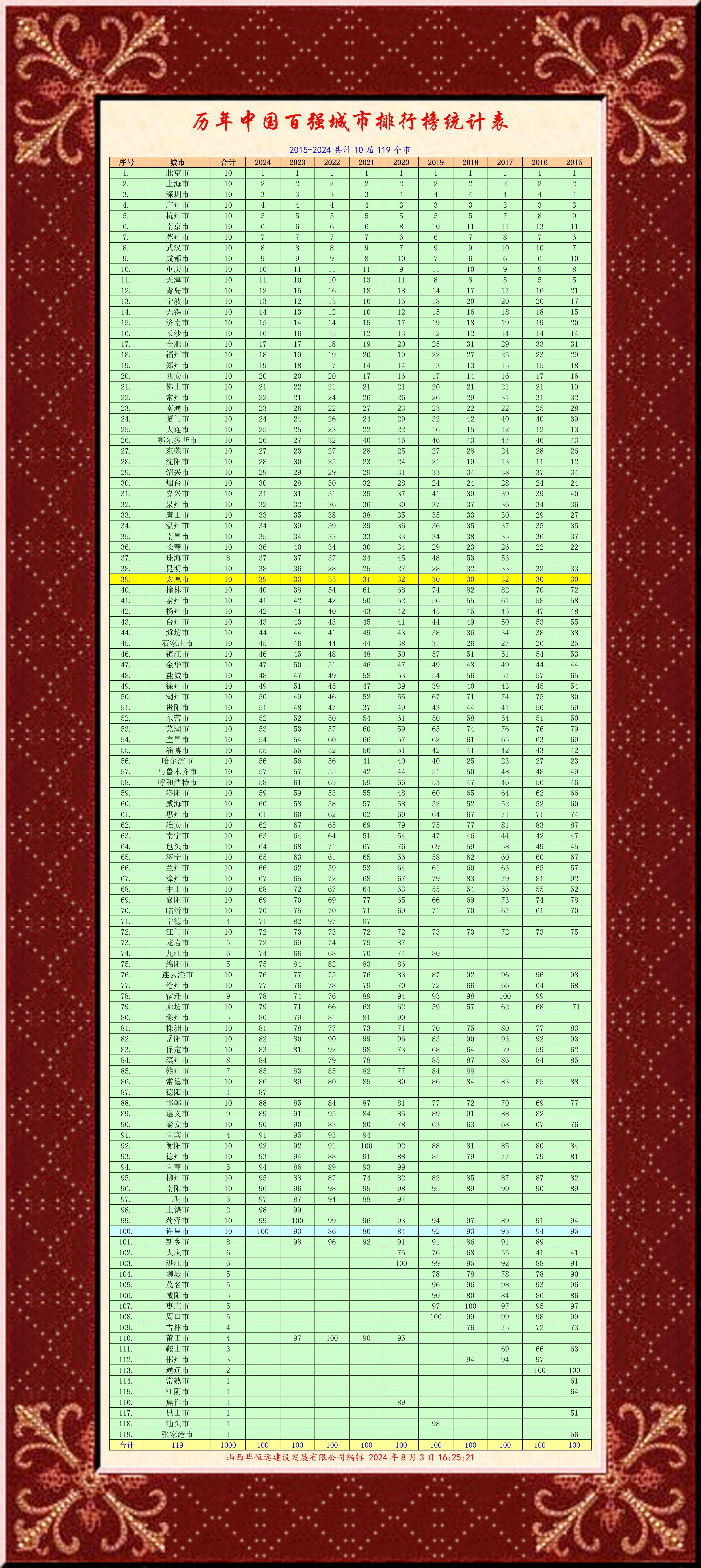 歷年中國百強城市排行榜統(tǒng)計表
