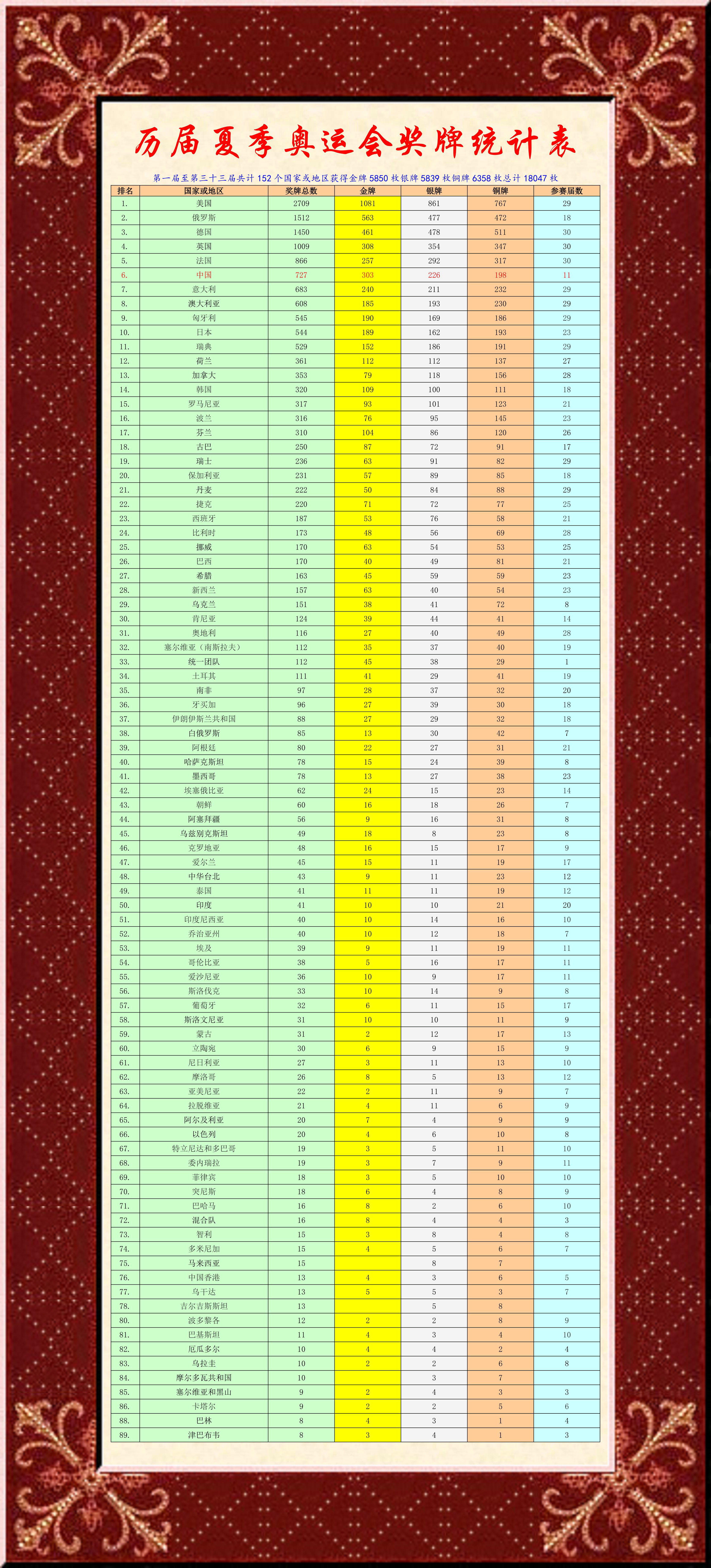 受巴黎奧運會中國體育代表團為國爭光為尊嚴榮譽而拼的民族氣節(jié)感染,花了整整三天時間七十二小時連軸轉,編輯了這份完整的《歷屆夏季奧林匹克運動會獎牌榜》,算作對所有參賽和觀賽人們的褒獎,讓歷史永遠記錄他們的事跡,這是我完成這項工作的初心和信心!