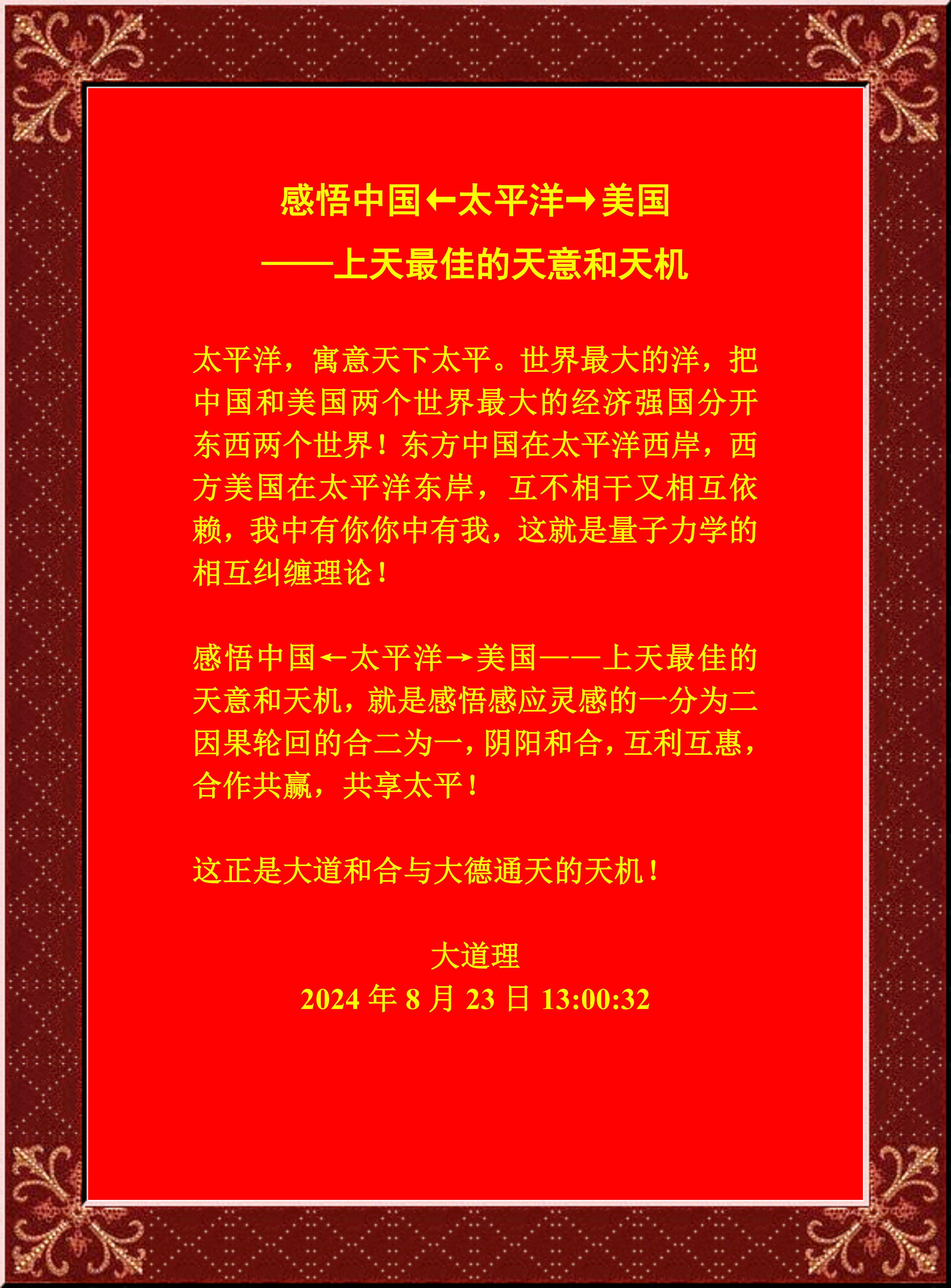 感悟中國(guó)←太平洋→美國(guó)——上天最佳的天意和天機(jī),就是感悟感應(yīng)靈感的一分為二因果輪回的合二為一,陰陽(yáng)和合,互利互惠,合作共贏,共享太平!