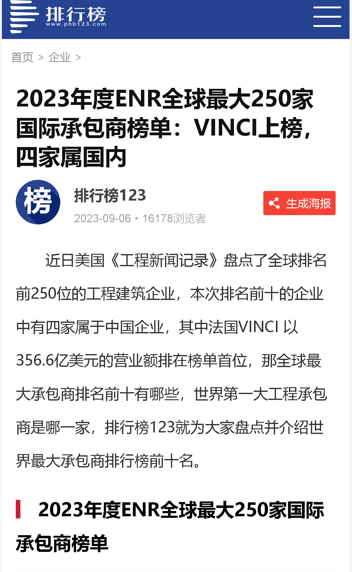 【行業(yè)資料】中國內(nèi)地61家企業(yè)躋身2023年度ENR全球承包商250強(qiáng)