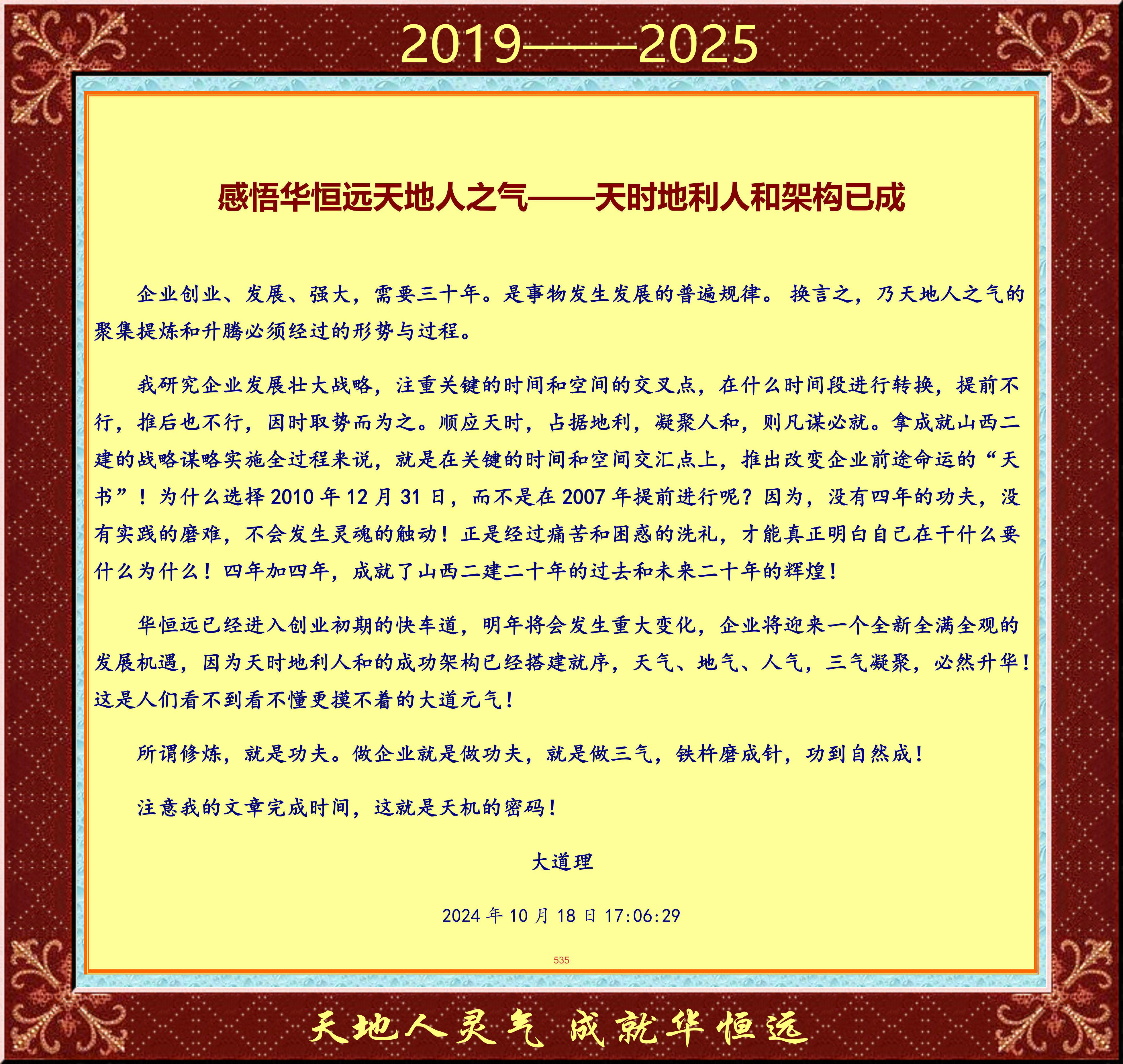 華恒遠(yuǎn)已經(jīng)進(jìn)入創(chuàng)業(yè)初期的快車道,明年將會(huì)發(fā)生重大變化,企業(yè)將迎來(lái)一個(gè)全新全滿全觀的發(fā)展機(jī)遇,因?yàn)樘鞎r(shí)地利人和的成功架構(gòu)已經(jīng)搭建就序,天氣、地氣、人氣,三氣凝聚,必然升華!這是人們看不到看不懂更摸不著的大道元?dú)猓?/span>