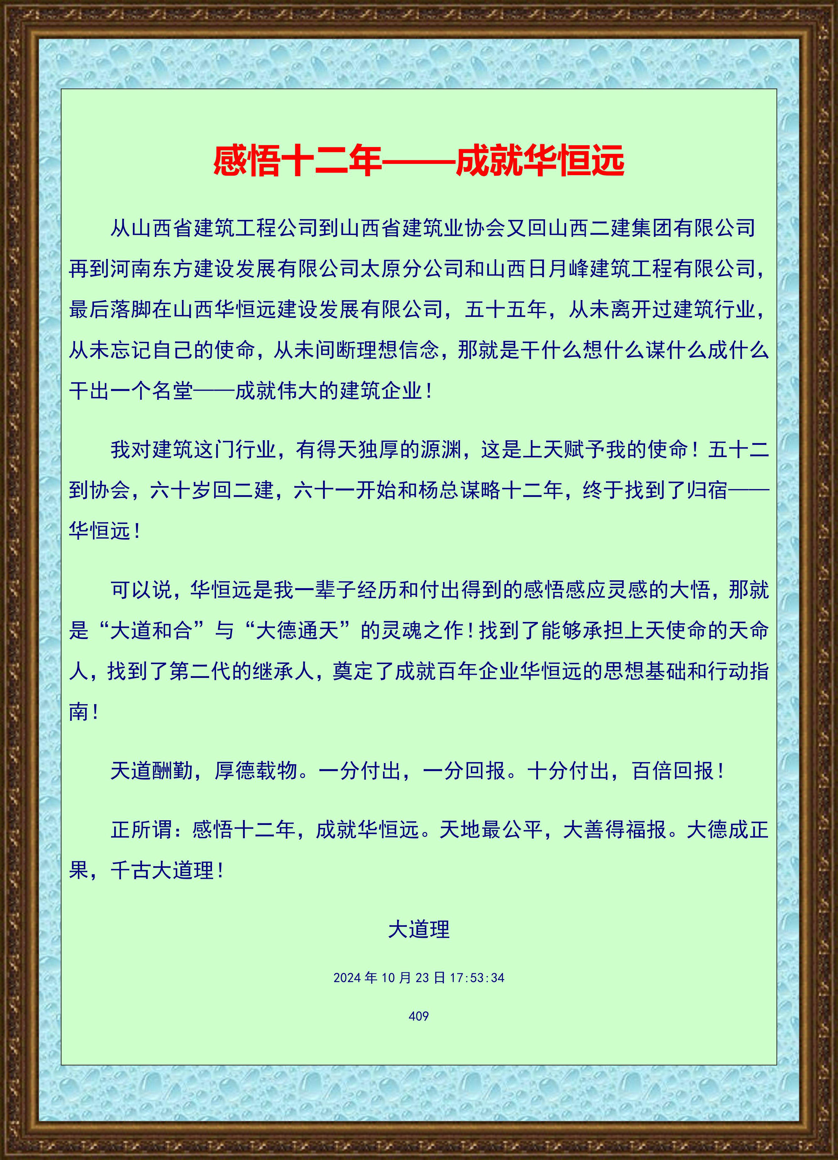 可以說,華恒遠(yuǎn)是我一輩子經(jīng)歷和付出得到的感悟感應(yīng)靈感的大悟,那就是“大道和合”與“大德通天”的靈魂之作!找到了能夠承擔(dān)上天使命的天命人,找到了第二代的繼承人,奠定了成就百年企業(yè)華恒遠(yuǎn)的思想基礎(chǔ)和行動(dòng)指南!