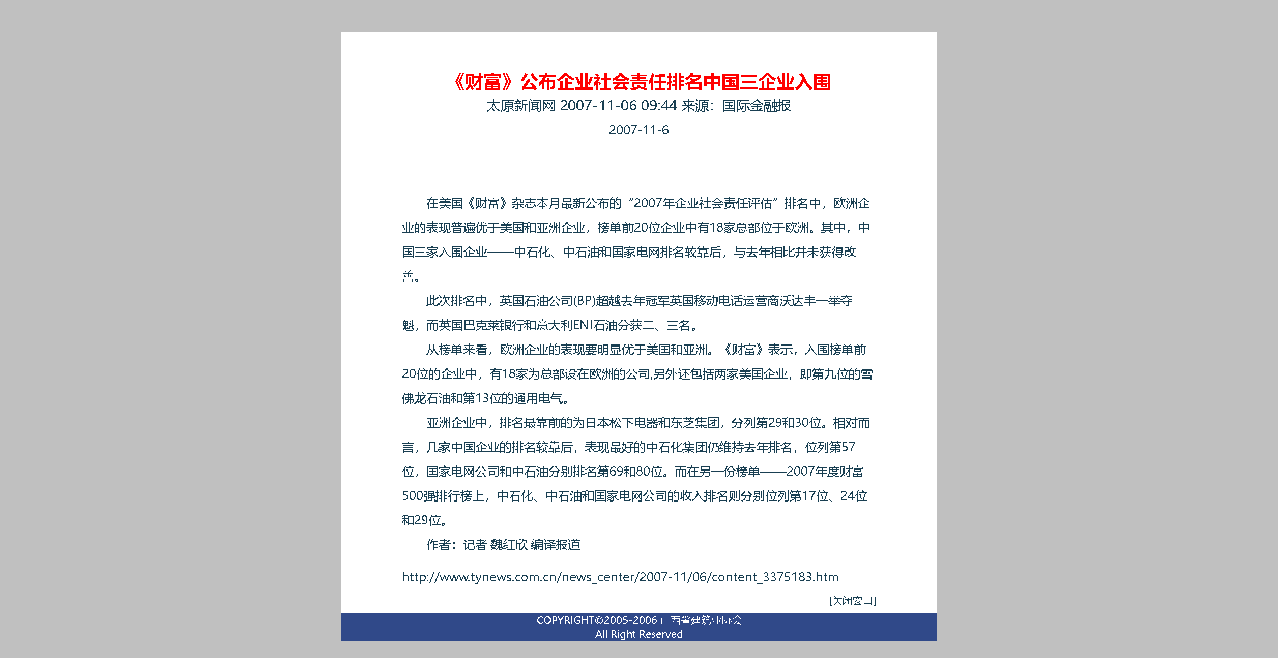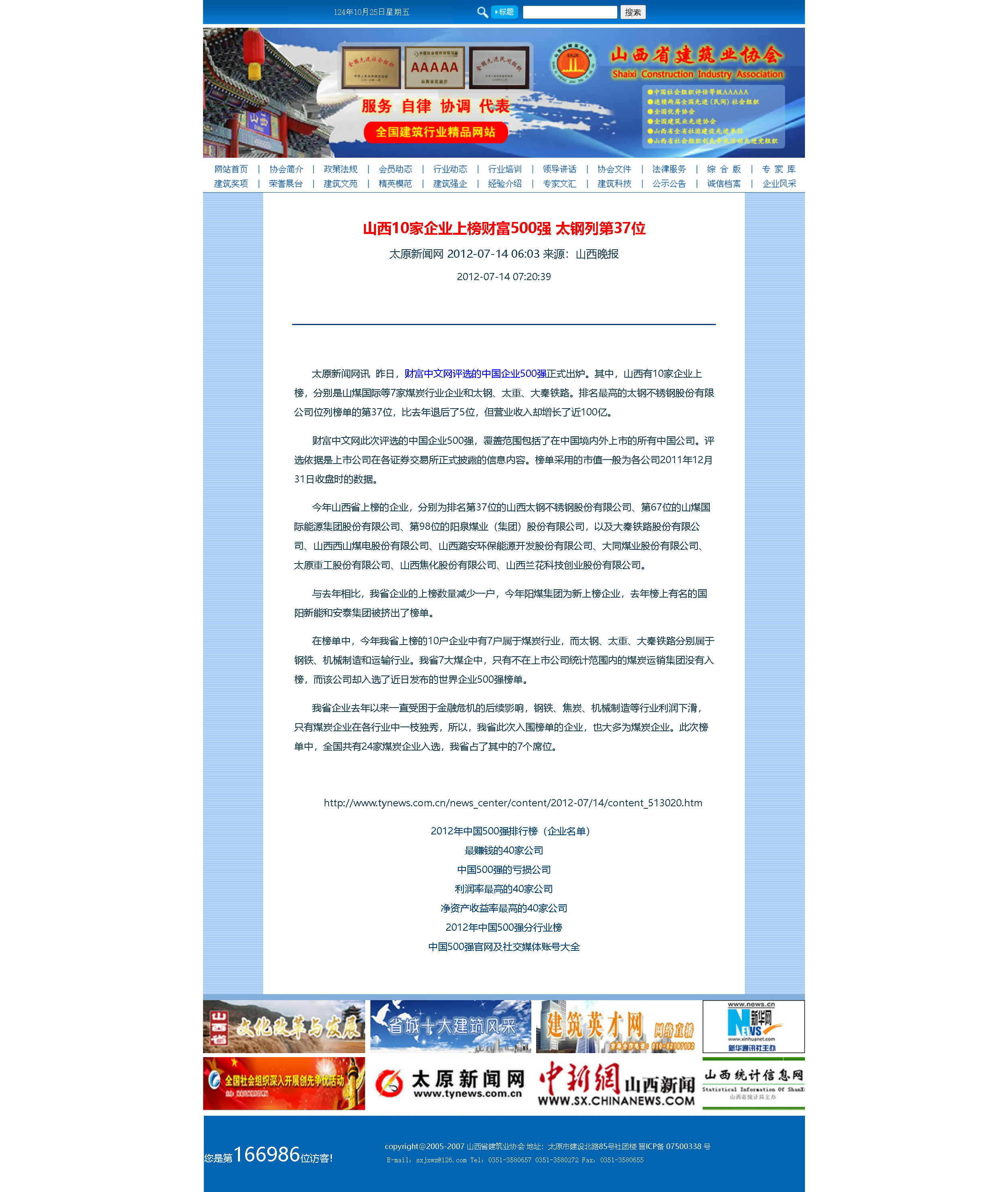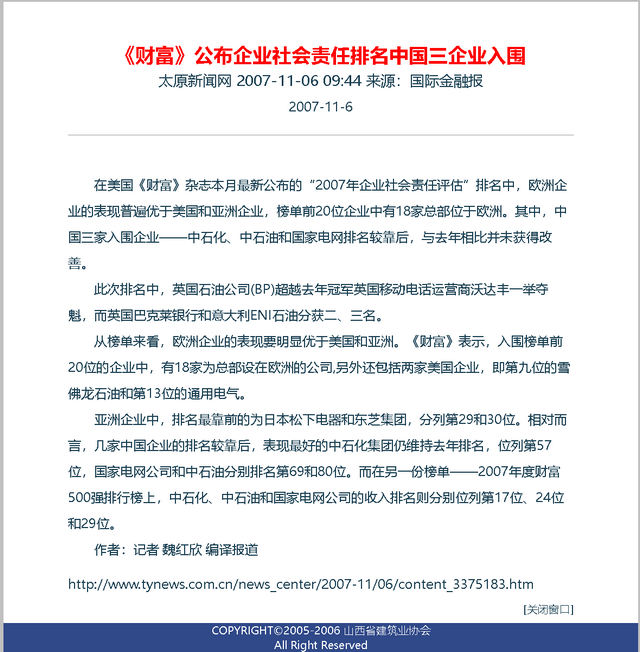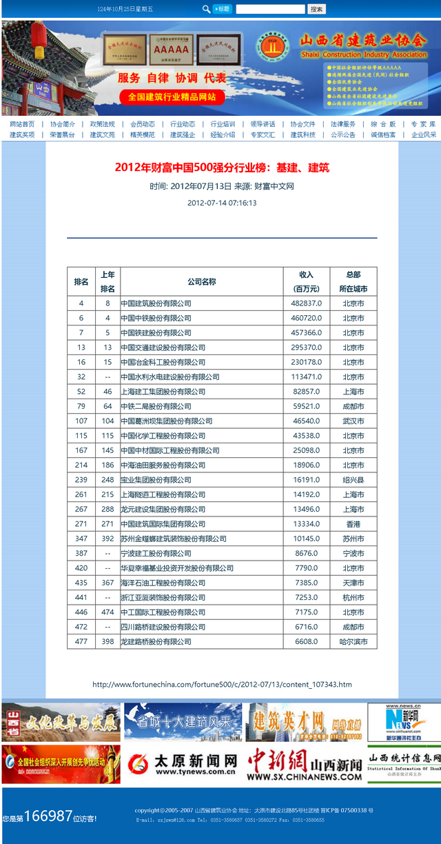 二十年前,第一次發(fā)現(xiàn)北方網(wǎng)世界500強專題報道這個欄目,激發(fā)起強烈的興趣和愛好,由此一發(fā)而不可收。尤其是在建筑業(yè)協(xié)會搞網(wǎng)站,更是把關(guān)注重點放在分門別類的排行榜上,及時轉(zhuǎn)載并且保存起來。