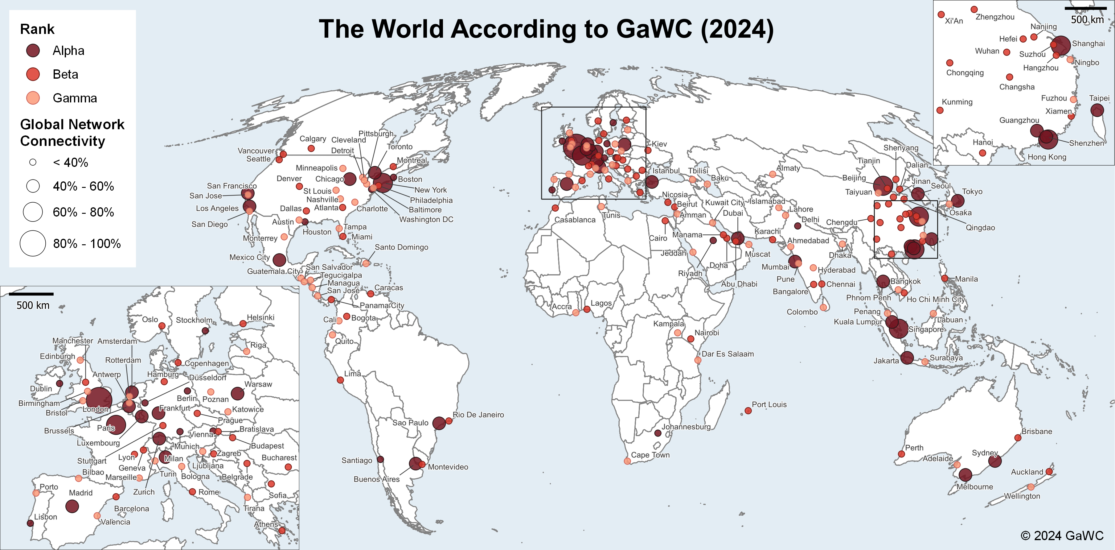 使用 GaWC 的聯(lián)鎖網(wǎng)絡(luò)模型對城市的先進(jìn)生產(chǎn)性服務(wù)業(yè)進(jìn)行評估。流量的間接測量用于計(jì)算城市的網(wǎng)絡(luò)連通性,從而衡量城市融入世界城市網(wǎng)絡(luò)的程度。