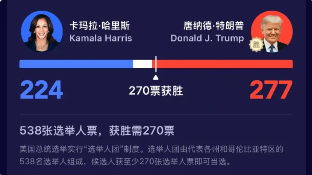 《紐約時(shí)報(bào)》的選舉追蹤器給出特朗普獲勝的概率為 84%,而《華盛頓郵報(bào)》的預(yù)測(cè)則表示,特朗普有可能在選舉團(tuán)人選舉中占優(yōu)勢(shì)。