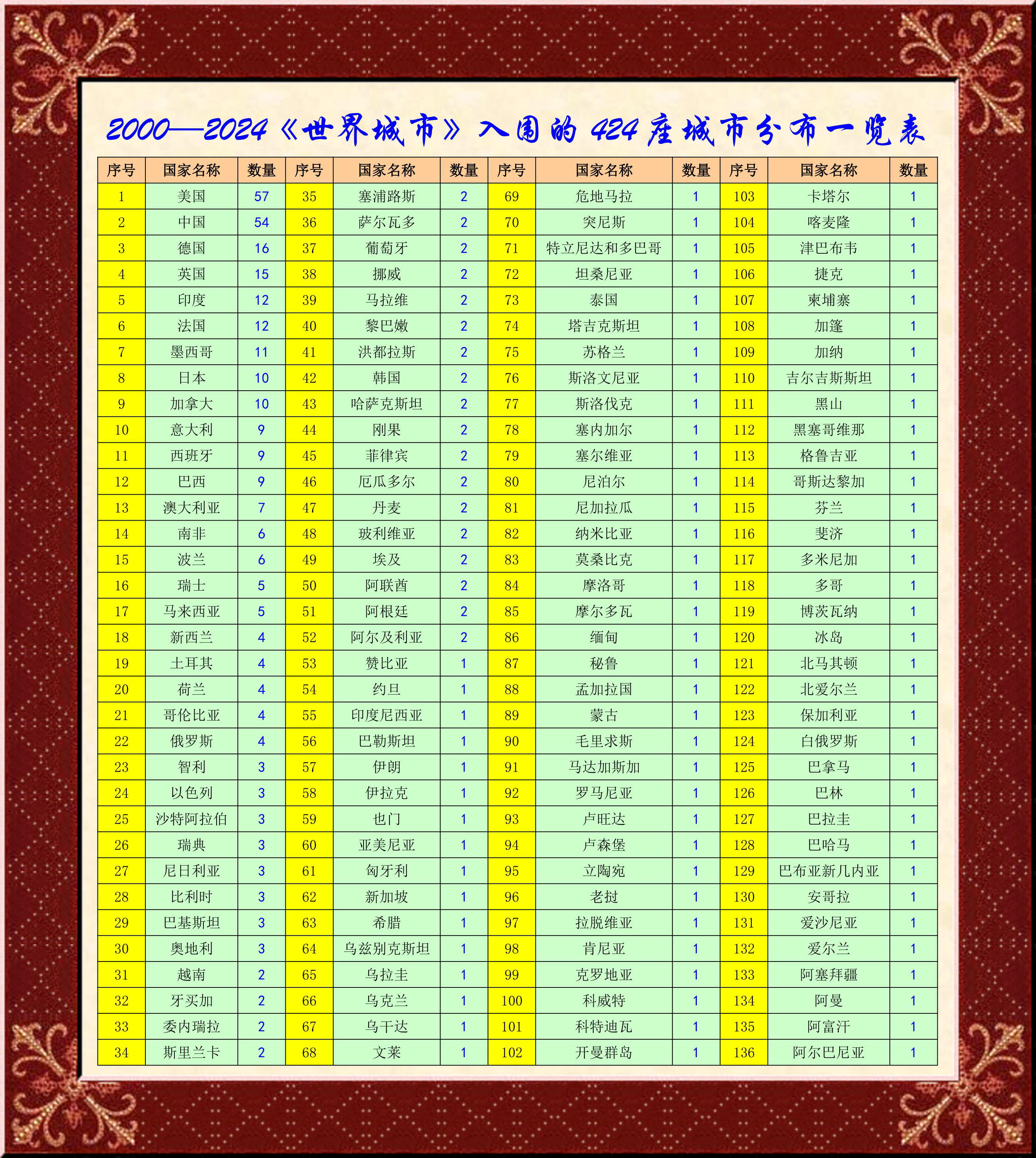于是,再翻騰出來,一個城市一個城市查閱所在地(所屬國),添加到統(tǒng)計表中。有了這個資料,編輯分布一覽表那就易如反掌,可以清清楚楚看明白我們在哪個區(qū)段是什么維度!美國第一57個城市,中國第二54個城市,相差無幾不分伯仲!