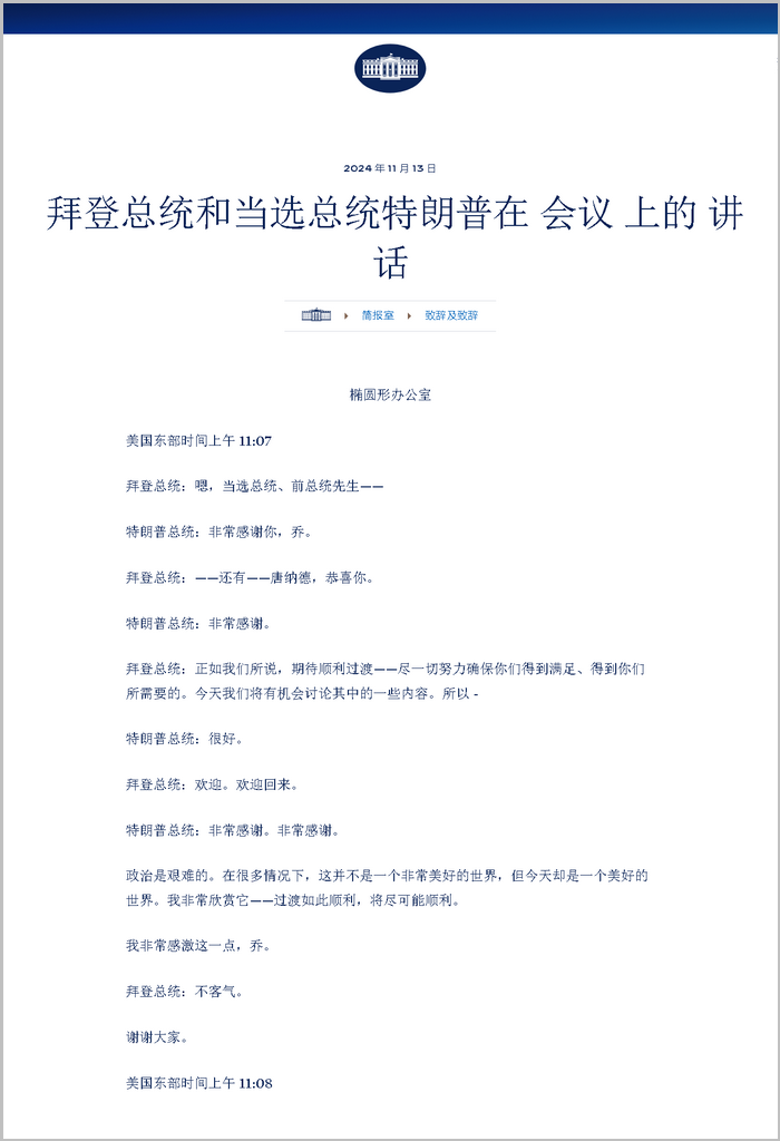 拜登總統(tǒng):正如我們所說(shuō),期待順利過(guò)渡——盡一切努力確保你們得到滿足、得到你們所需要的。今天我們將有機(jī)會(huì)討論其中的一些內(nèi)容。所以-