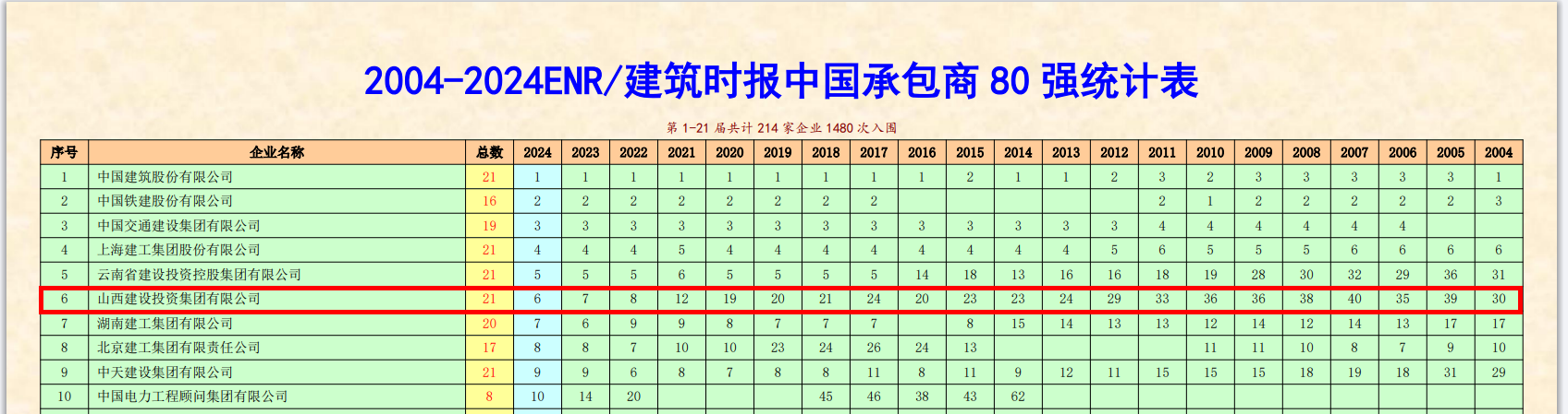 上周我在一篇文章中說到今年《建筑時報》ENR中國承包商80強該發(fā)榜了,今天如約而至,山西建投排名第六,孩子們干的不錯嘛!