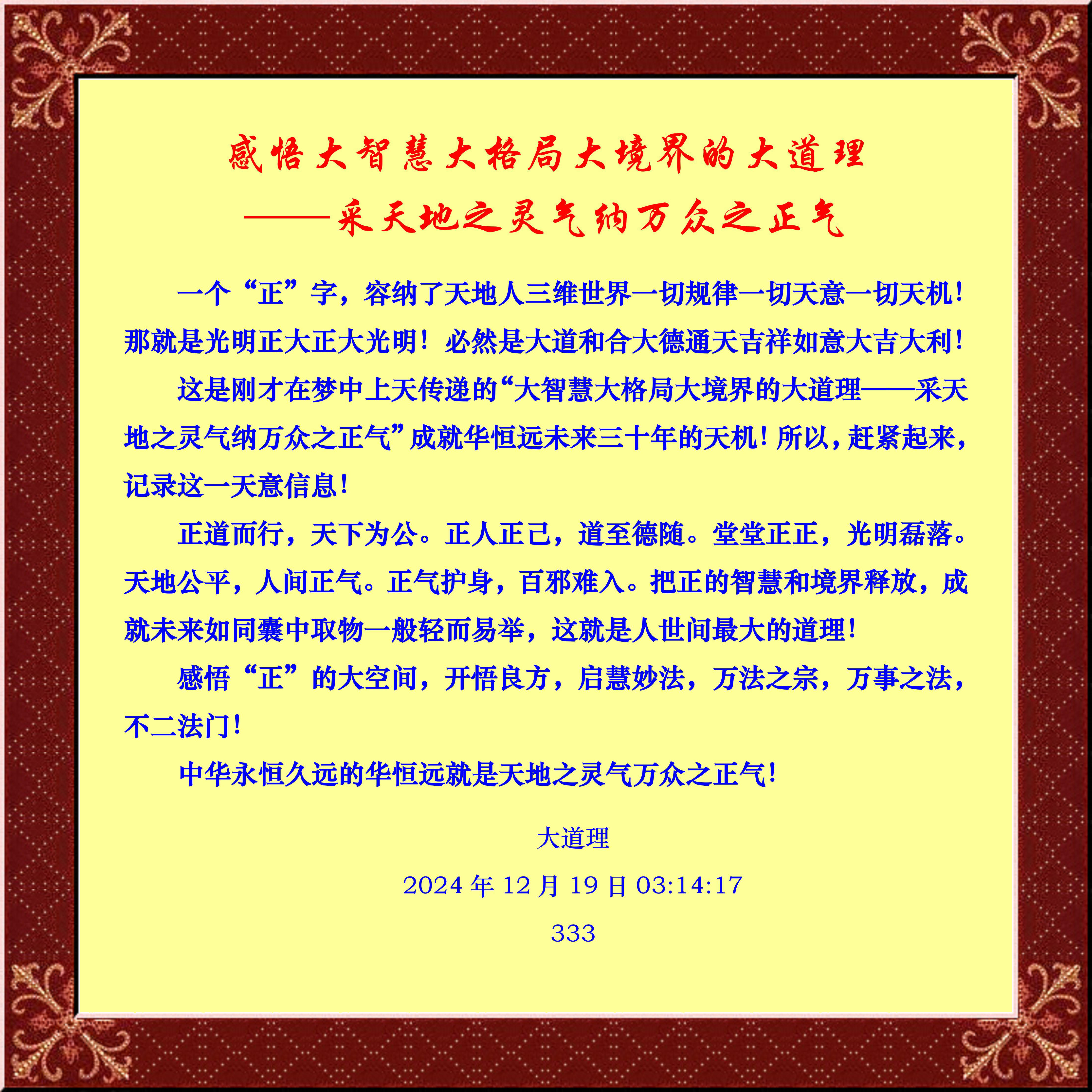 一個(gè)“正”字,容納了天地人三維世界一切規(guī)律一切天意一切天機(jī)!那就是光明正大正大光明!必然是大道和合大德通天的吉祥如意大吉大利!