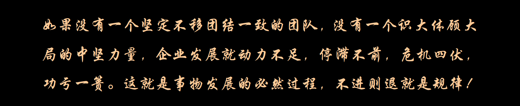 如果沒有一個堅定不移團結(jié)一致的團隊,沒有一個識大體顧大局的中堅力量,企業(yè)發(fā)展就動力不足,停滯不前,危機四伏,功虧一簣。這就是事物發(fā)展的必然過程,不進則退就是規(guī)律!