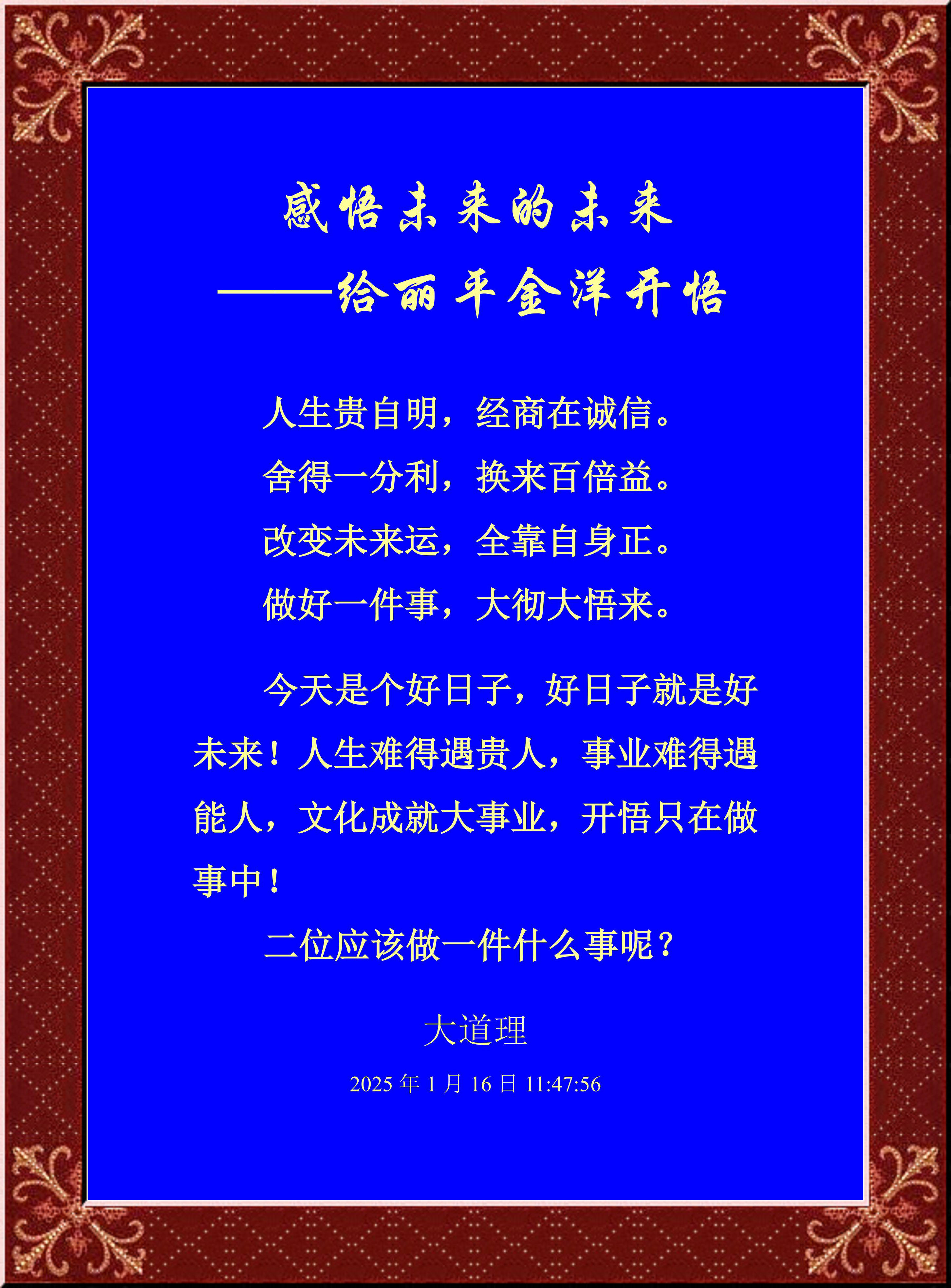 今天是個(gè)好日子,好日子就是好未來!人生難得遇貴人,事業(yè)難得遇能人,文化成就大事業(yè),開悟只在做事中!