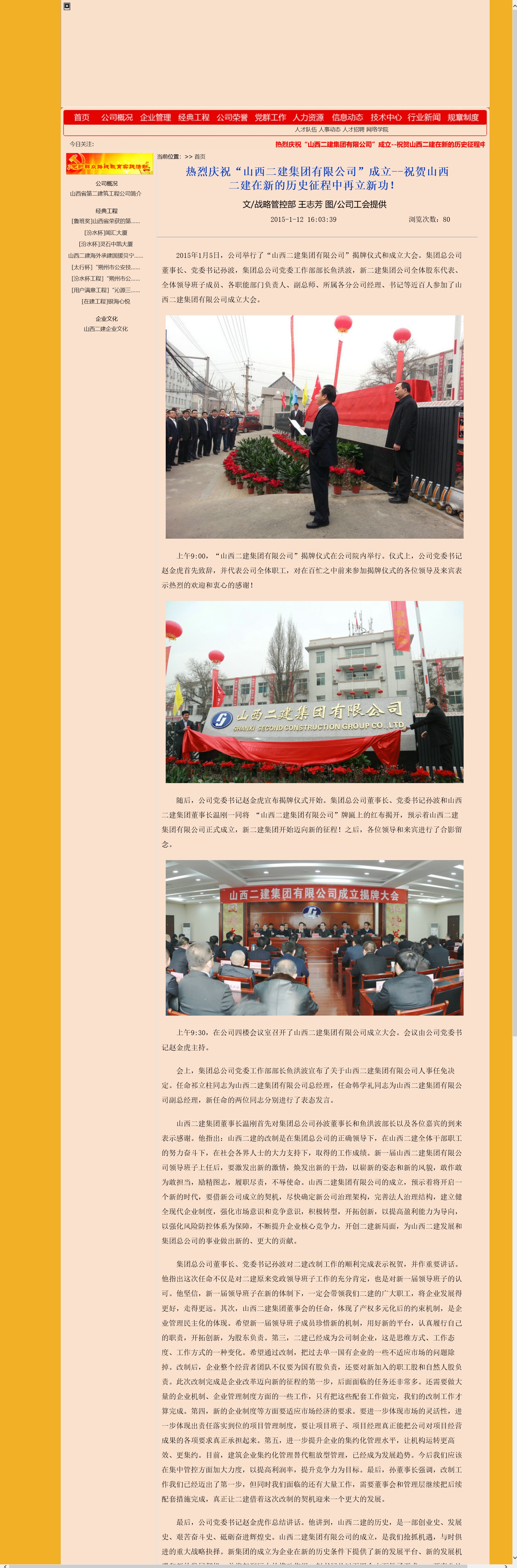 當(dāng)時(shí),他立刻打電話通知對(duì)方原路返回,表示承擔(dān)一切損失。隨后完全按照我的意見實(shí)施,就連字體都是征求我的意見制作的。2015年1月5日,山西二建集團(tuán)有限公司揭牌儀式順利進(jìn)行,使用近三十五年的山西省第二建筑工程公司名稱正式退出歷史舞臺(tái),宣告改制后的山西二建正式成立!