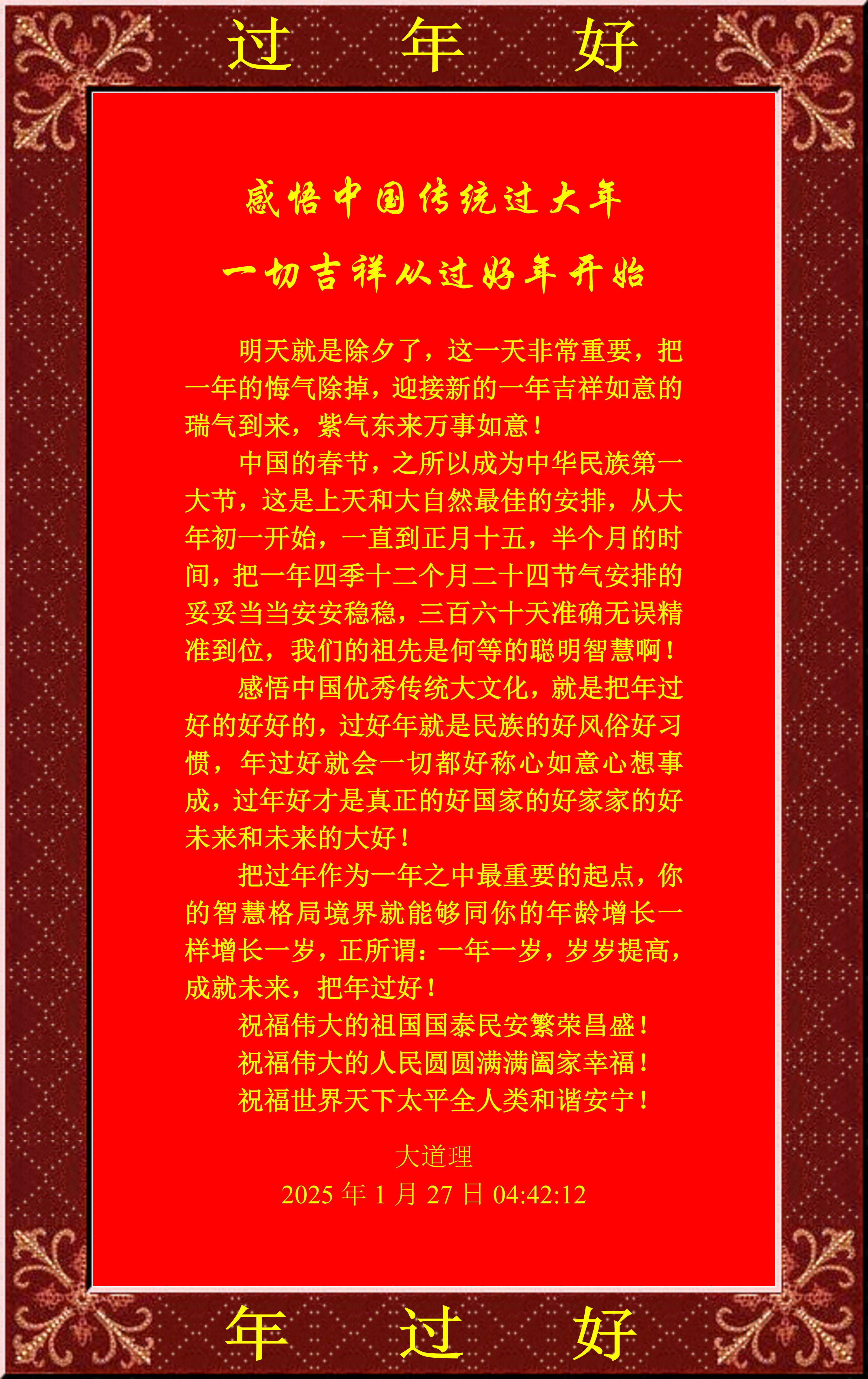 感悟中國(guó)優(yōu)秀傳統(tǒng)大文化,就是把年過好的好好的,過好年就是民族的好風(fēng)俗好習(xí)慣,年過好就會(huì)一切都好稱心如意心想事成,過年好才是真正的好國(guó)家的好家家的好未來和未來的大好!
