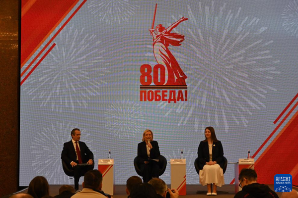 11月19日,在俄羅斯莫斯科,俄羅斯文化部長(zhǎng)柳比莫娃(中)介紹紀(jì)念衛(wèi)國(guó)戰(zhàn)爭(zhēng)勝利80周年活動(dòng)計(jì)劃。新華社記者 江宥林 攝