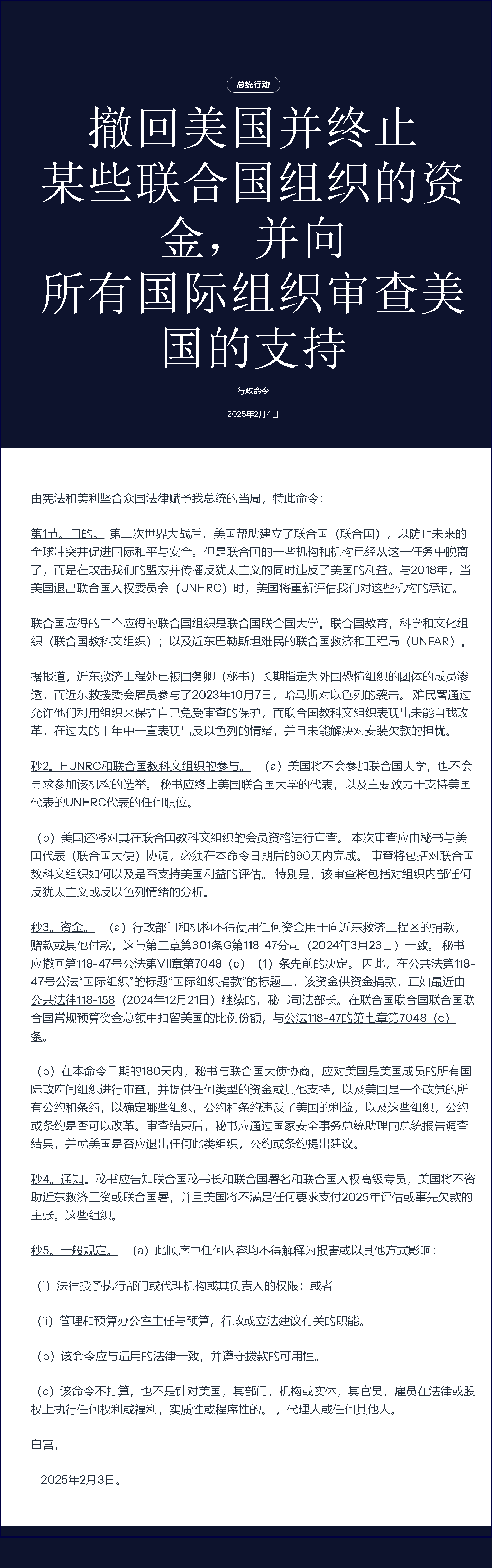行政令還要求繼續(xù)停止向聯(lián)合國近東巴勒斯坦難民救濟和工程處(近東救濟工程處)提供支持,并評估美國在聯(lián)合國教科文組織中的參與情況。