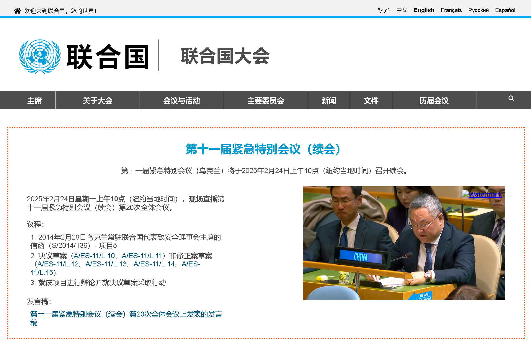 2025年2月24日星期一上午10點(紐約當?shù)貢r間),現(xiàn)場直播第十一屆緊急特別會議(續(xù)會)第20次全體會議。
