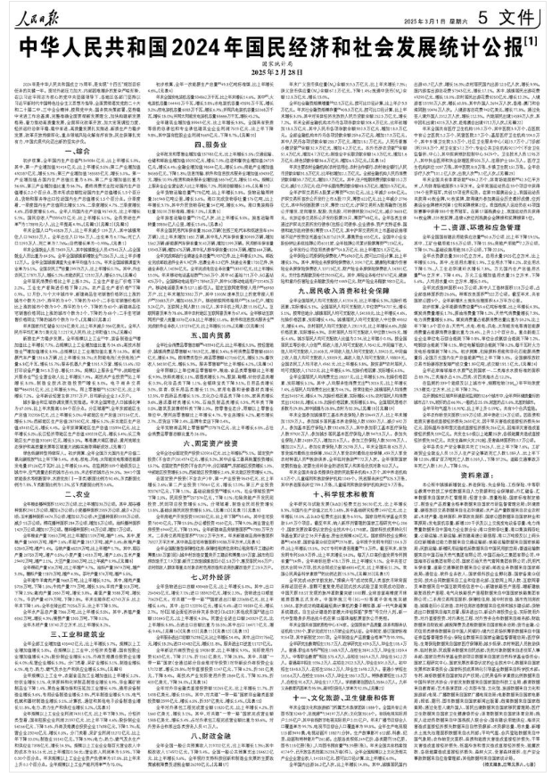 今天,國家統(tǒng)計局公布了《中華人民共和國2024年國民經(jīng)濟和社會發(fā)展統(tǒng)計公報》。