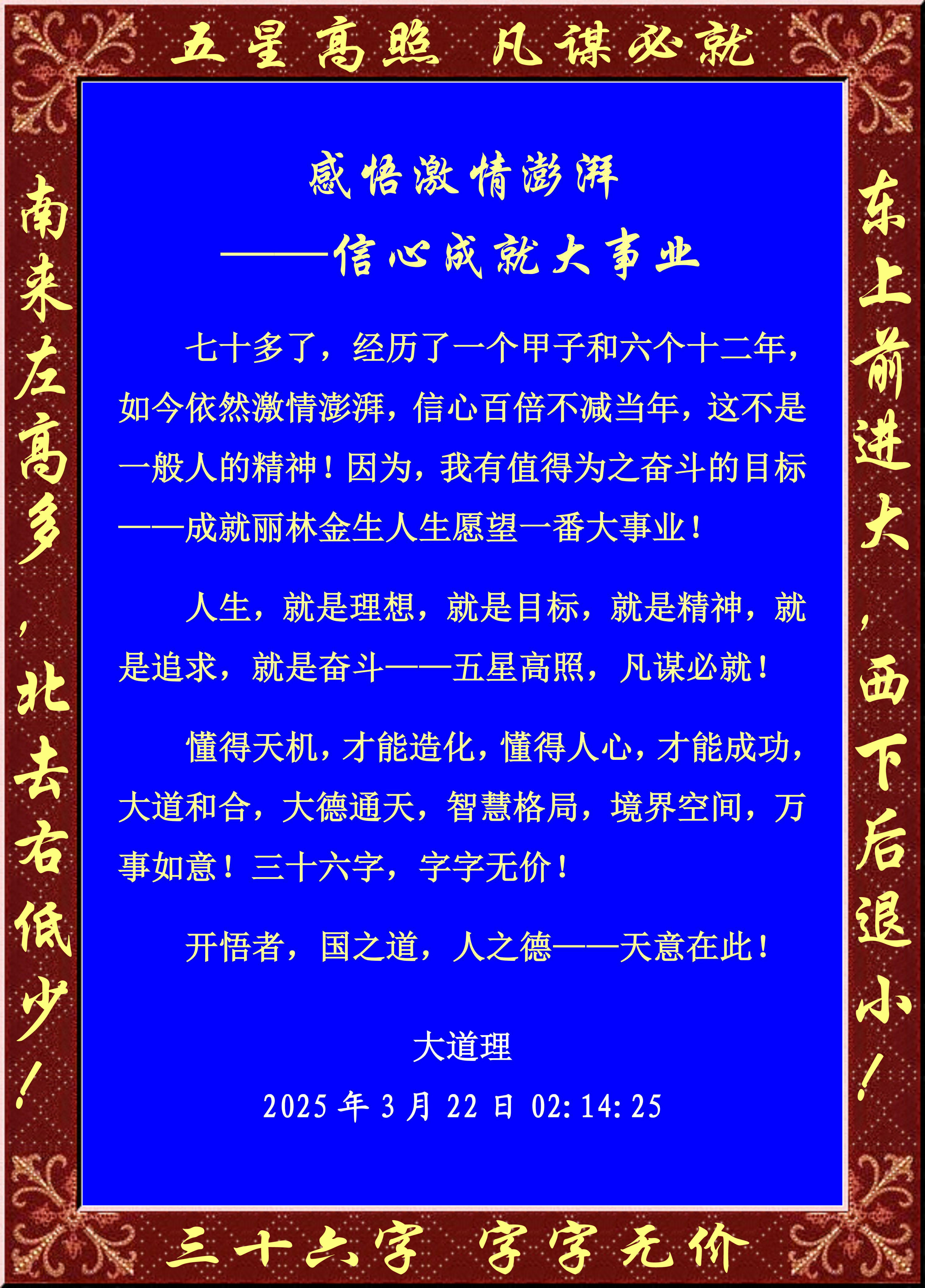 人生,就是理想,就是目標(biāo),就是精神,就是追求,就是奮斗——五星高照,凡謀必就!懂得天機(jī),才能造化,懂得人心,才能成功,大道和合,大德通天,智慧格局,境界空間,萬事如意!三十六字,字字無價(jià)!