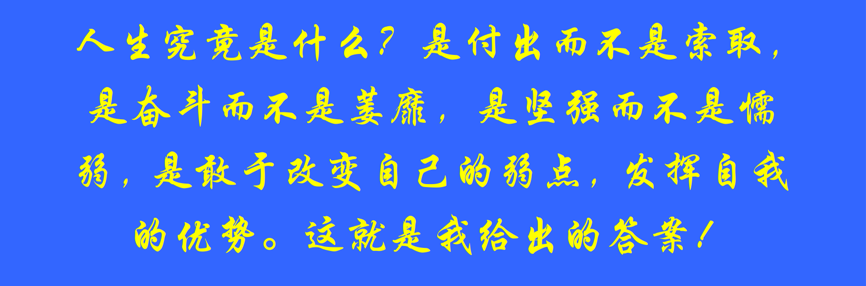每個人都有自己的選擇,即人生的態(tài)度。這就區(qū)分了人生的境界和高度,劃分了不同的人群和不同的階層,產(chǎn)生了千變萬化社會的形態(tài),這就是人與人的差別,這就是覺悟是人生最大的財富和成就未來的靈丹妙藥!