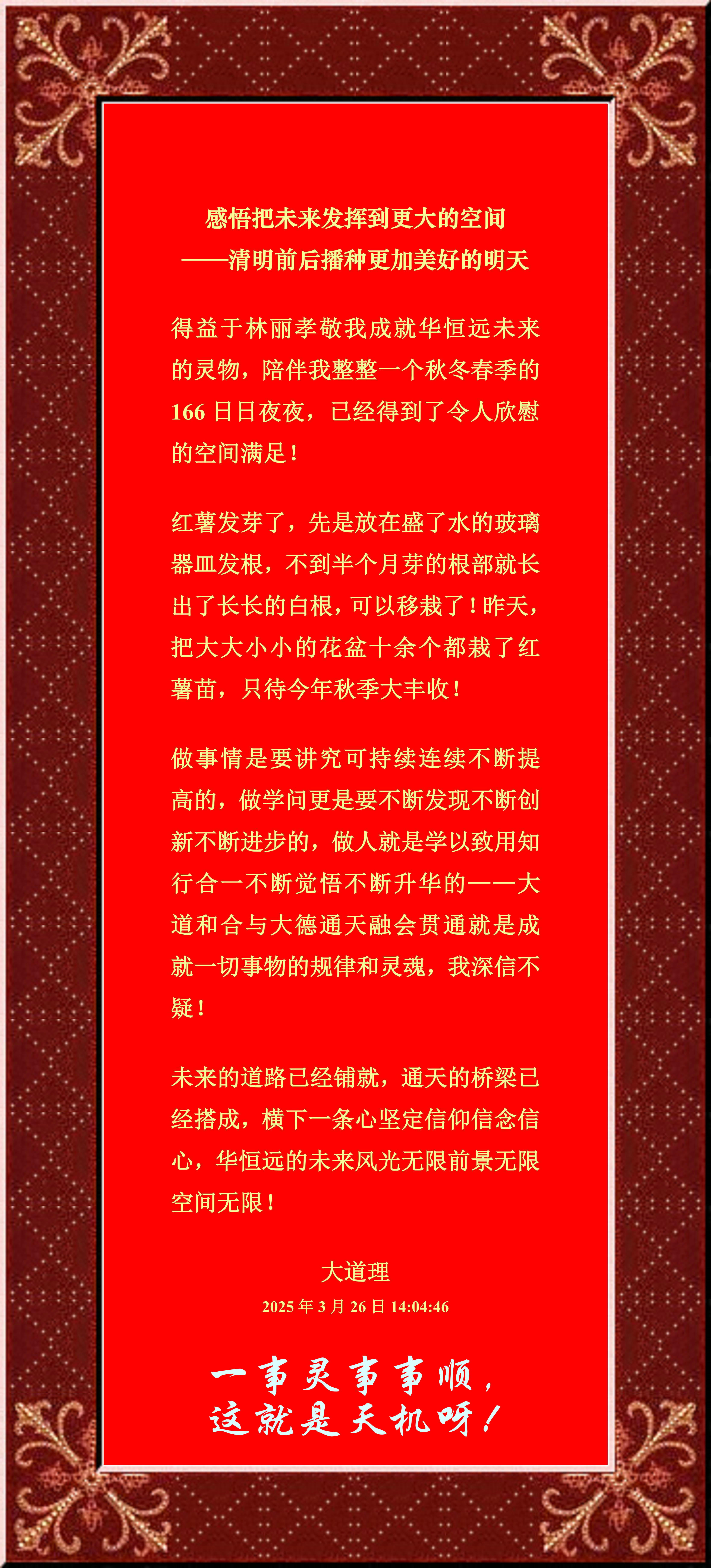得益于林麗孝敬我成就華恒遠未來的靈物,陪伴我整整一個秋冬春季的166個日日夜夜,已經(jīng)得到了令人欣慰的空間滿足!