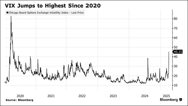 “關(guān)稅焦慮席卷華爾街”,CNN稱,雖然美國(guó)當(dāng)天(4日)發(fā)布的就業(yè)增長(zhǎng)數(shù)據(jù)超出預(yù)期,但關(guān)稅焦慮依然主導(dǎo)市場(chǎng)情緒。芝加哥期權(quán)交易所(Cboe)波動(dòng)率指數(shù)(即VIX“恐慌指數(shù)”)暴漲50%,飆升至45以上,達(dá)2020年以來最高點(diǎn)。