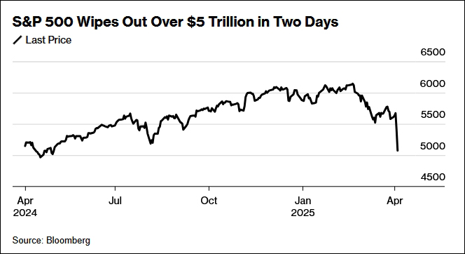 美國(guó)總統(tǒng)特朗普2日宣布“對(duì)等關(guān)稅”后,美國(guó)股市連續(xù)第二天跳水。當(dāng)?shù)貢r(shí)間4日,美股三大指數(shù)均暴跌超過5%。其中,標(biāo)普500指數(shù)兩個(gè)交易日內(nèi)蒸發(fā)市值達(dá)5.4萬(wàn)億美元,創(chuàng)下新紀(jì)錄;納斯達(dá)克指數(shù)從近期高位累計(jì)跌超20%,確認(rèn)進(jìn)入熊市。