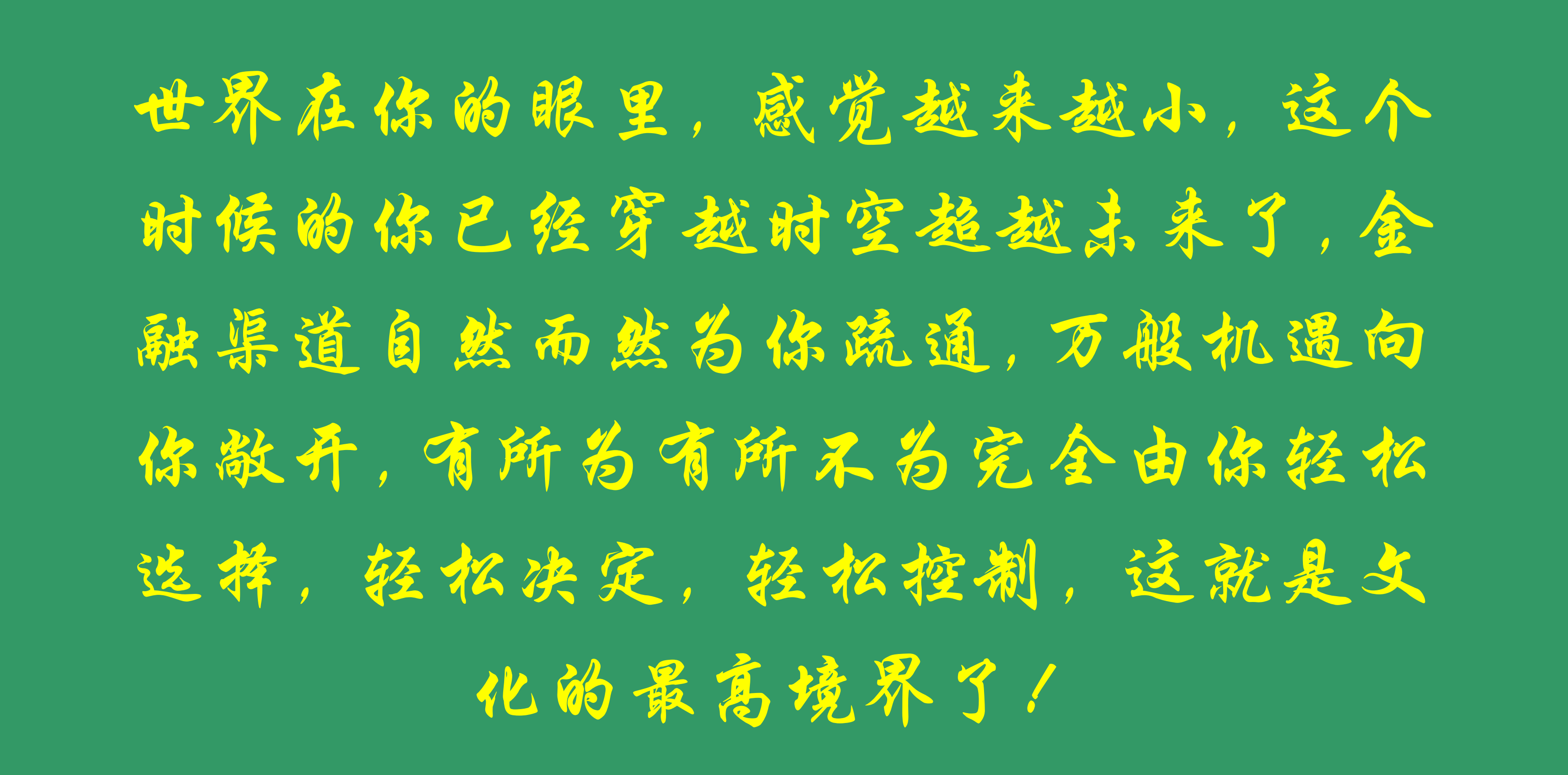 做一個企業(yè)家,一個世界級的大企業(yè)家,必須有高度的覺悟,高度的責(zé)任,高度的主動,這就是使命感和事業(yè)心的高度統(tǒng)一,高度融合,高度完善。上升到這個高度,你的公司才能越做越大,越做越強,越做越優(yōu)。世界在你的眼里,感覺越來越小,這個時候的你已經(jīng)穿越時空超越未來了,金融渠道自然而然為你疏通,萬般機遇向你敞開,有所為有所不為完全由你輕松選擇,輕松決定,輕松控制,這就是文化的最高境界了!