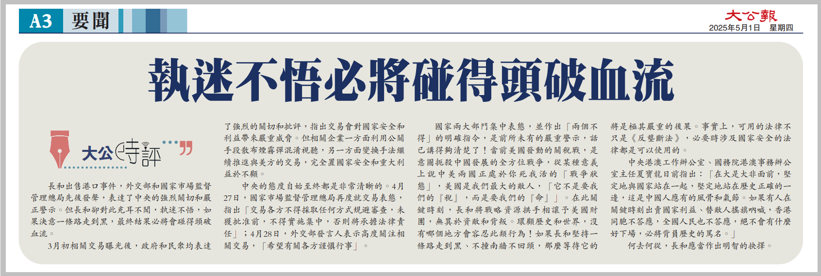 11 大公報(bào):香港政商界支持依法審查“非一般買賣” “大義面前無小事,長(zhǎng)和應(yīng)三思” 2025-03-31