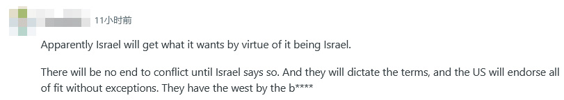 還有人指出,美國在中東地區(qū)的沖突中過于偏袒以色列,“顯然,以色列能得到它想要的,因為它是以色列。在以色列說出來之前,沖突不會結束,他們將決定條款,而美國將毫無例外地支持所有條件?!?