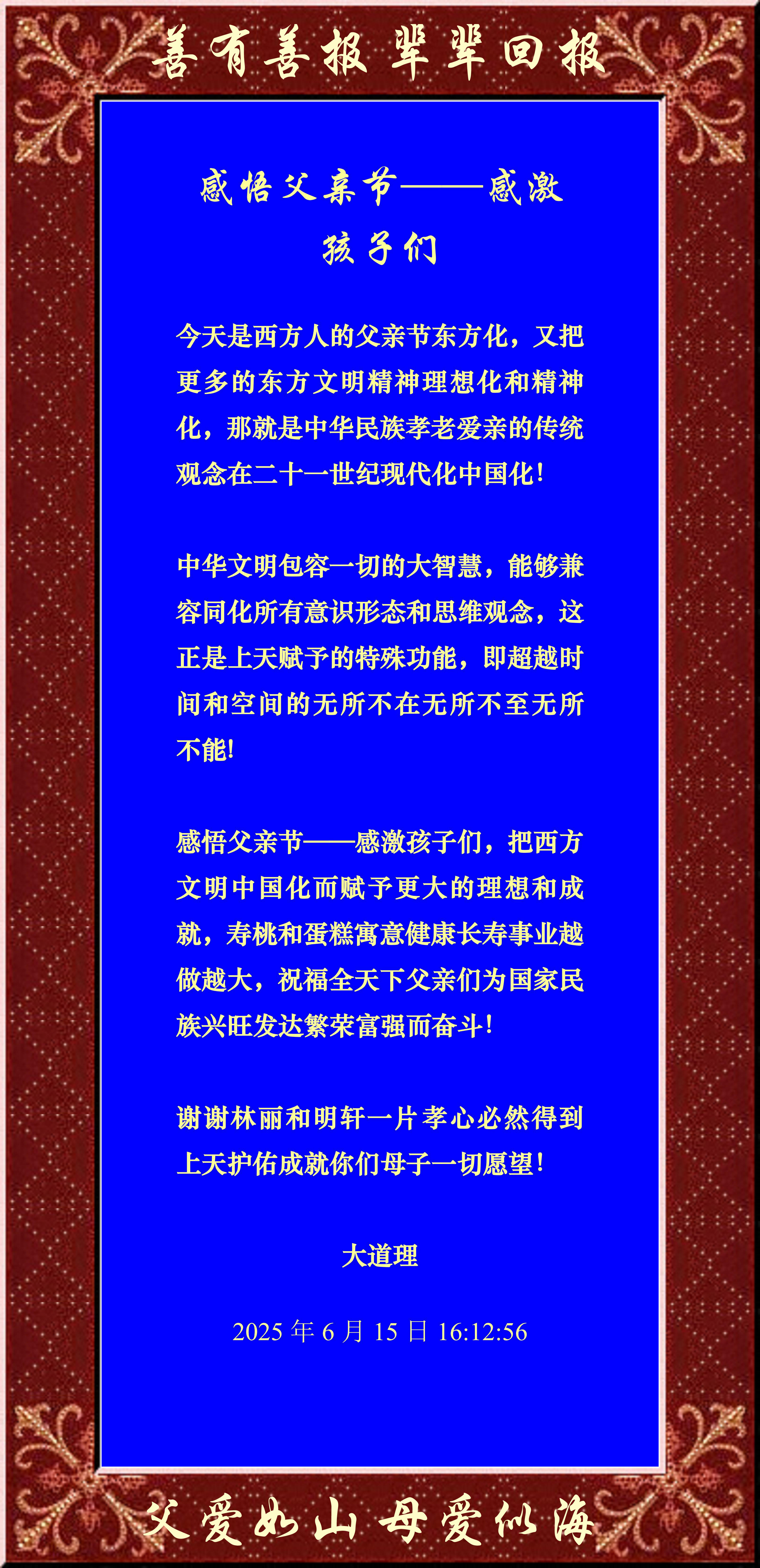 今天是西方人的父親節(jié)東方化,又把更多的東方文明精神理想化和精神化,那就是中華民族孝老愛親的傳統(tǒng)觀念在二十一世紀(jì)現(xiàn)代化中國化!