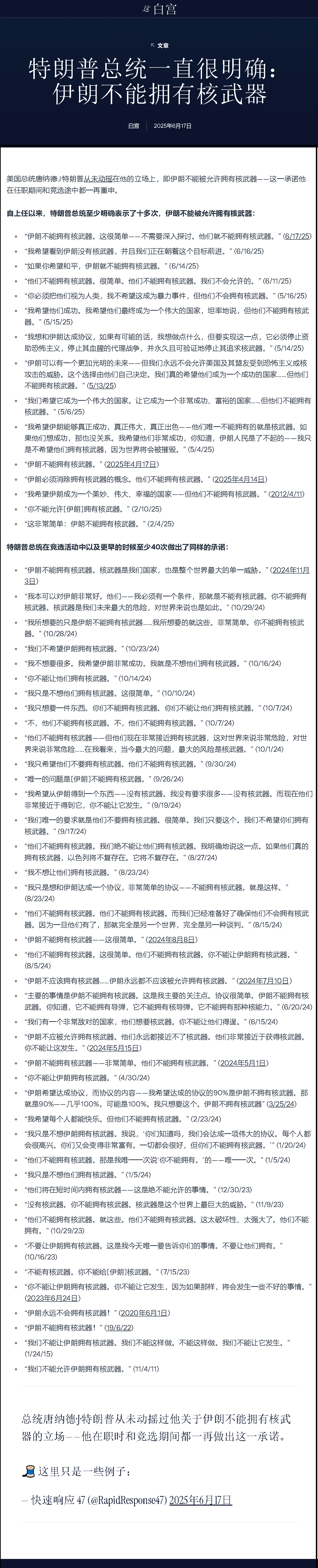 阻止伊朗獲得核武器一直是歷任美國政府和其他西方國家的目標。自今年4月以來,美伊雙方已在阿曼斡旋下進行了五輪核談判,但未取得實質(zhì)性突破。美國希望伊朗徹底終止可用于制造核武器的鈾濃縮項目,而伊朗則堅稱要保留該項目,并要求美方解除制裁,作為其在核計劃上做出任何讓步的交換條件。因以色列6月13日突襲,美伊原定于15日舉行的第六輪談判被取消。