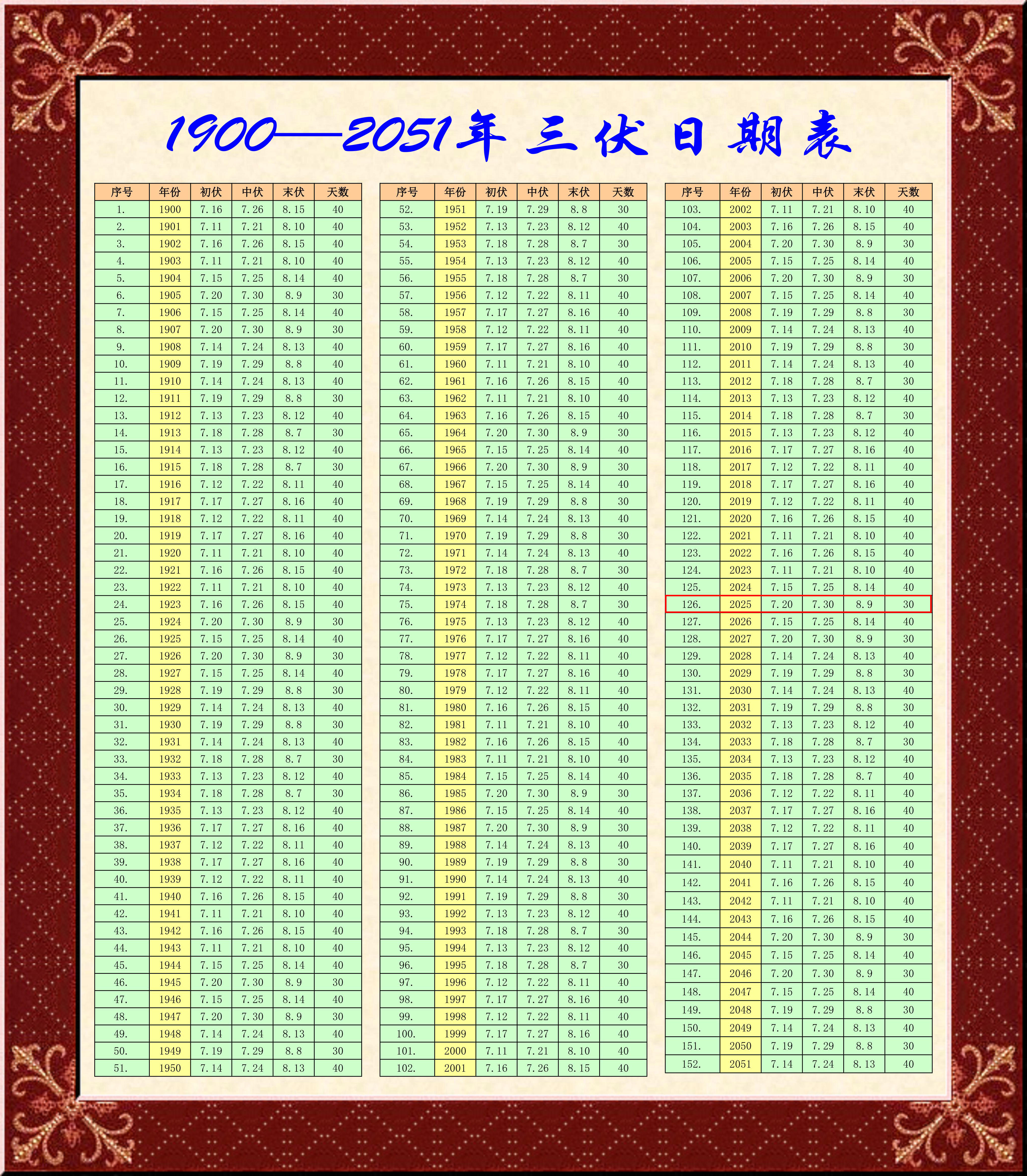 中伏 2025年7月30日-2025年8月8日,共10天;