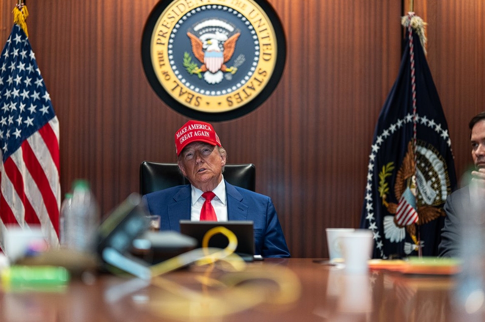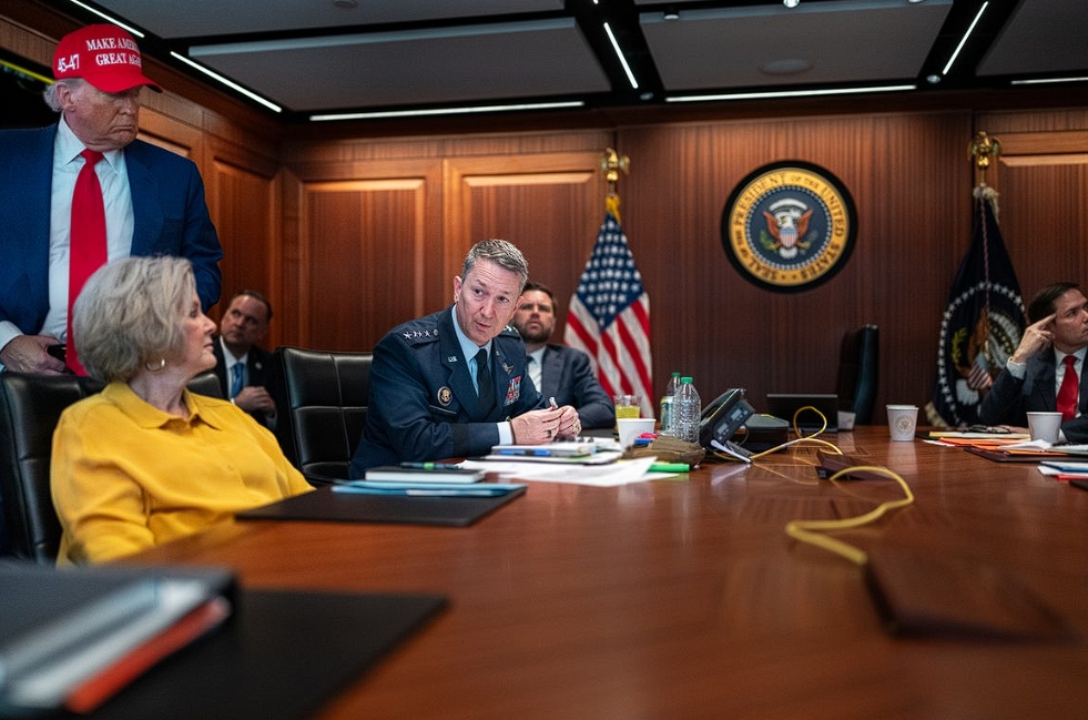 美國還是動手了。在美國總統(tǒng)特朗普宣布“成功打擊”伊朗三處核設施后,白宮在社交媒體X平臺上公布了若干張?zhí)乩势請F隊在戰(zhàn)情室內的畫面。