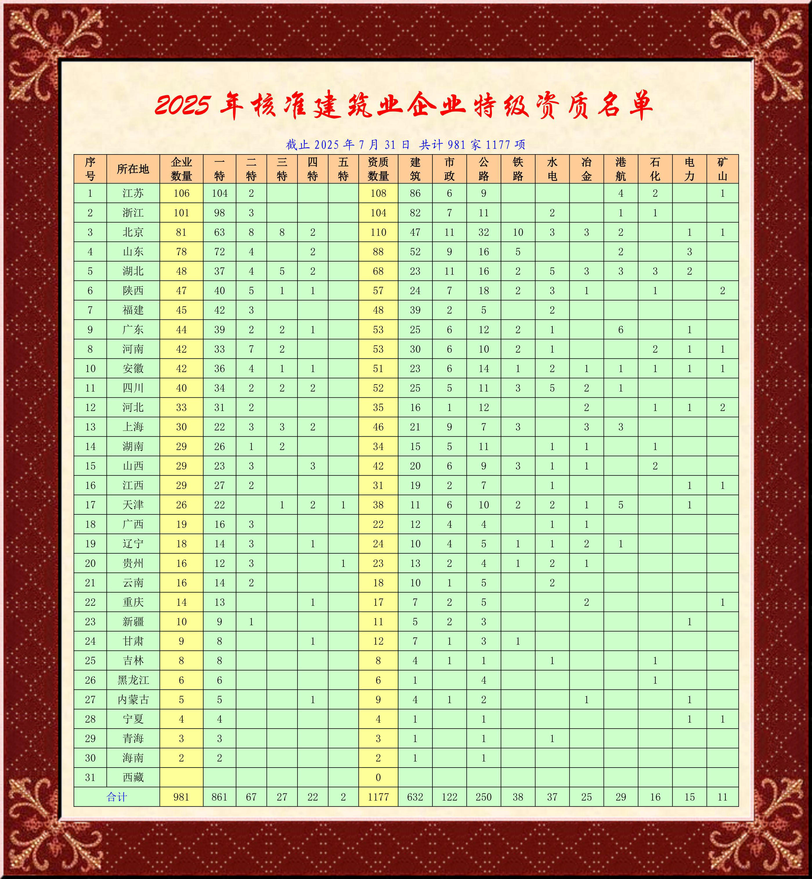 自2012年實(shí)施建筑業(yè)企業(yè)資質(zhì)等級(jí)就位以來(lái),特級(jí)企業(yè)第一方陣從十三年前的200多家,今年突破1000家已成定局,這是多么大的空間和變化?!