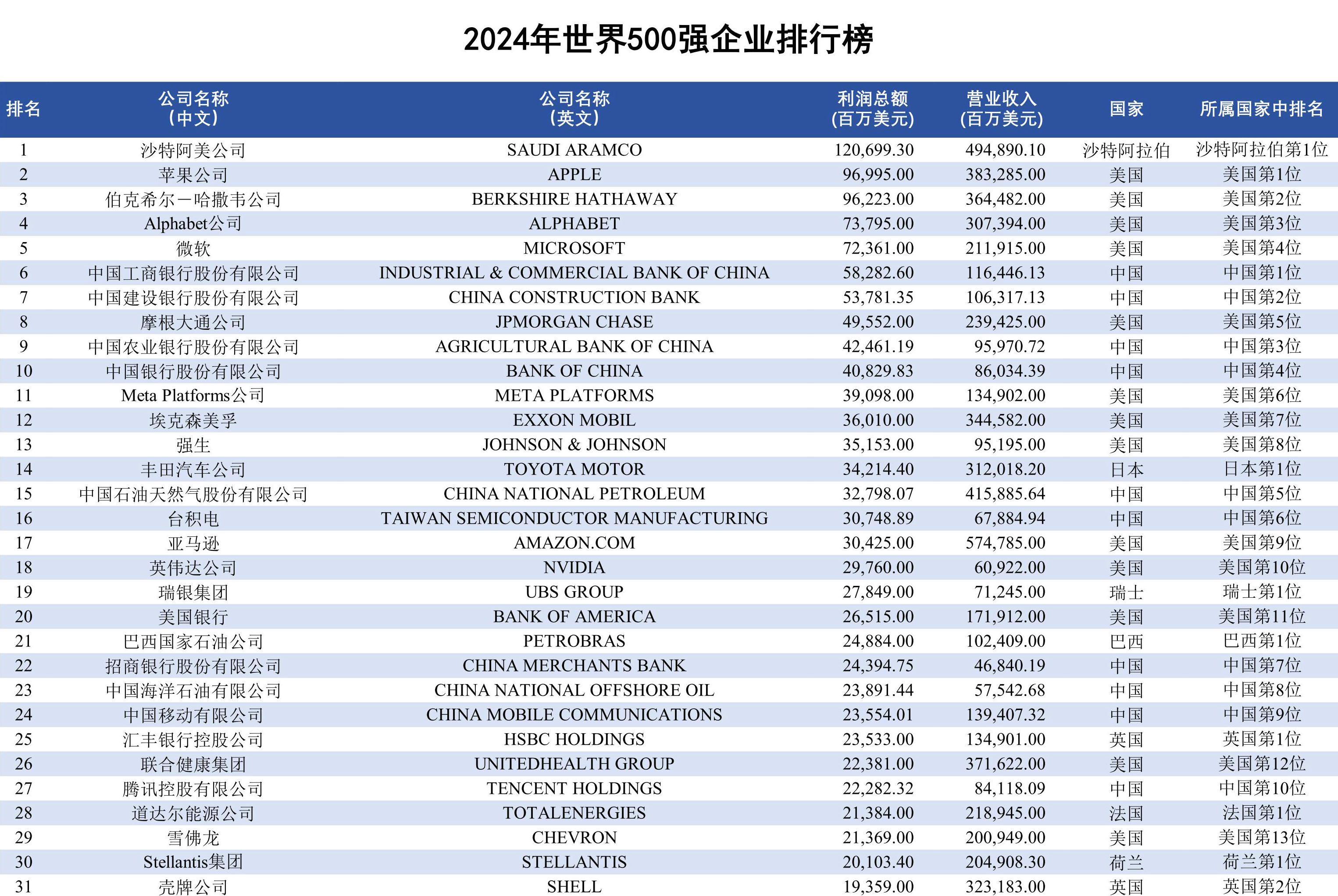 中國百強論壇、華東理工大學民營經(jīng)濟研究院和華頓經(jīng)濟研究院于12月30日在上海聯(lián)合發(fā)布“華頓版2024年世界500強企業(yè)排行榜”。不同于《財富》世界500強,該榜單是按照企業(yè)利潤額進行排序,原始數(shù)據(jù)主要來源于紐約、倫敦、東京、香港、新加坡、上海等全球各大交易所,部分數(shù)據(jù)來源于《財富》等媒體機構(gòu)。