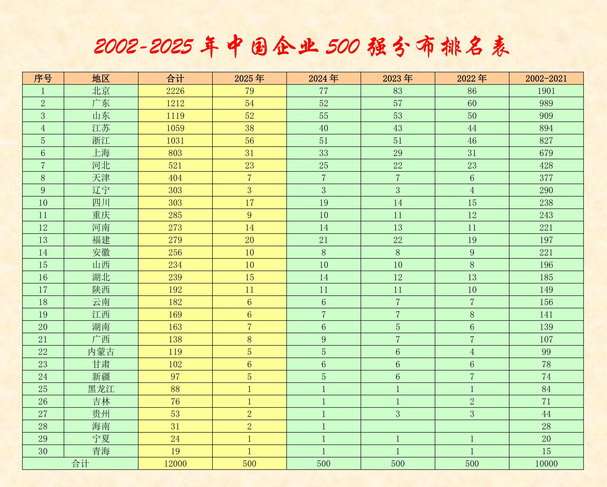 2025中國(guó)企業(yè)500強(qiáng)共分布在30個(gè)?。ㄗ灾螀^(qū)、直轄市)中,分布最多的五個(gè)地區(qū)依次是北京、浙江、廣東、山東和江蘇。