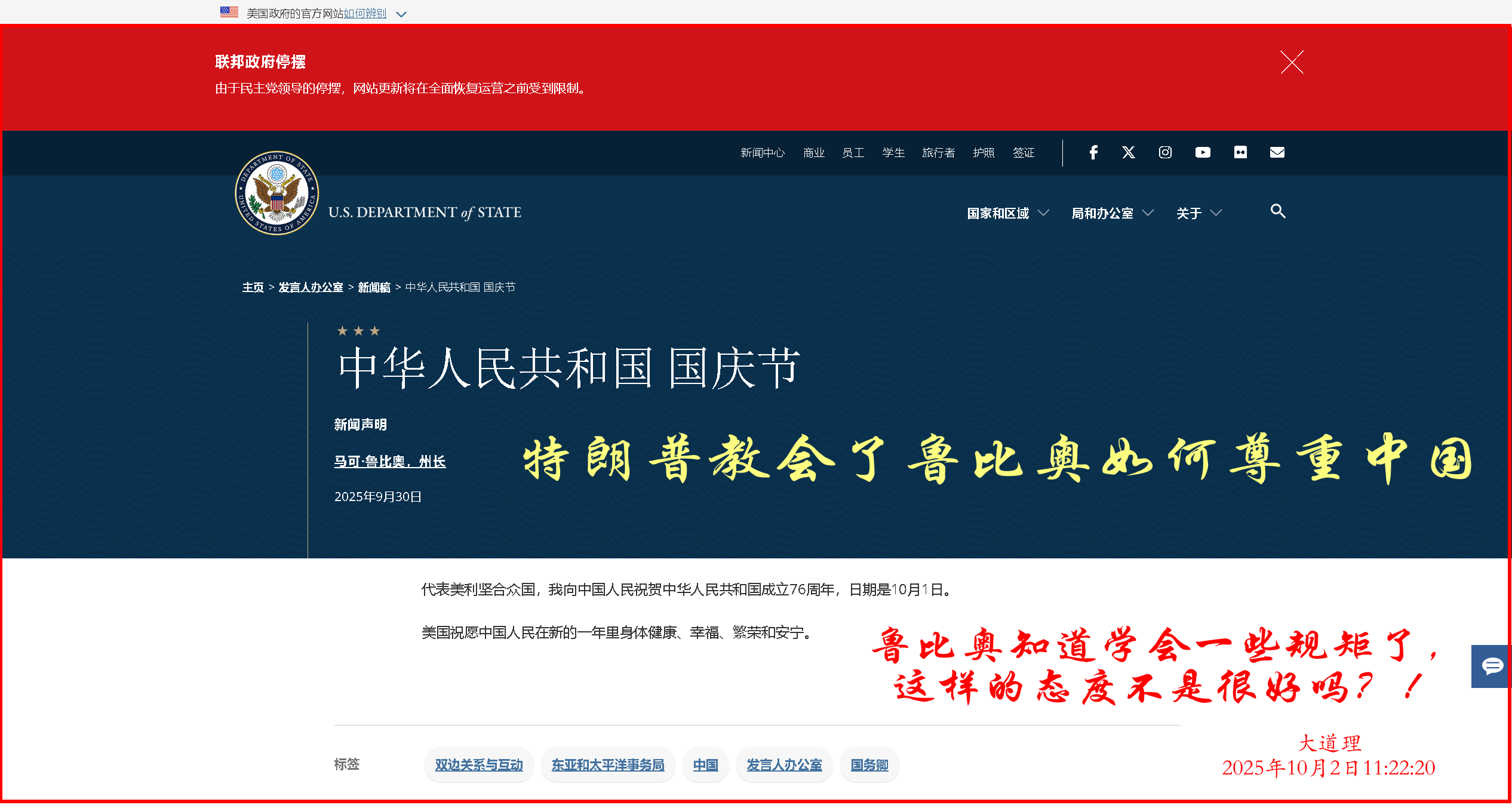 根據(jù)美國國務(wù)院網(wǎng)站當(dāng)?shù)貢r間9月30日消息,美國國務(wù)卿魯比奧發(fā)表簡短聲明:我謹(jǐn)代表美利堅合眾國,就中華人民共和國成立76周年表示祝賀。