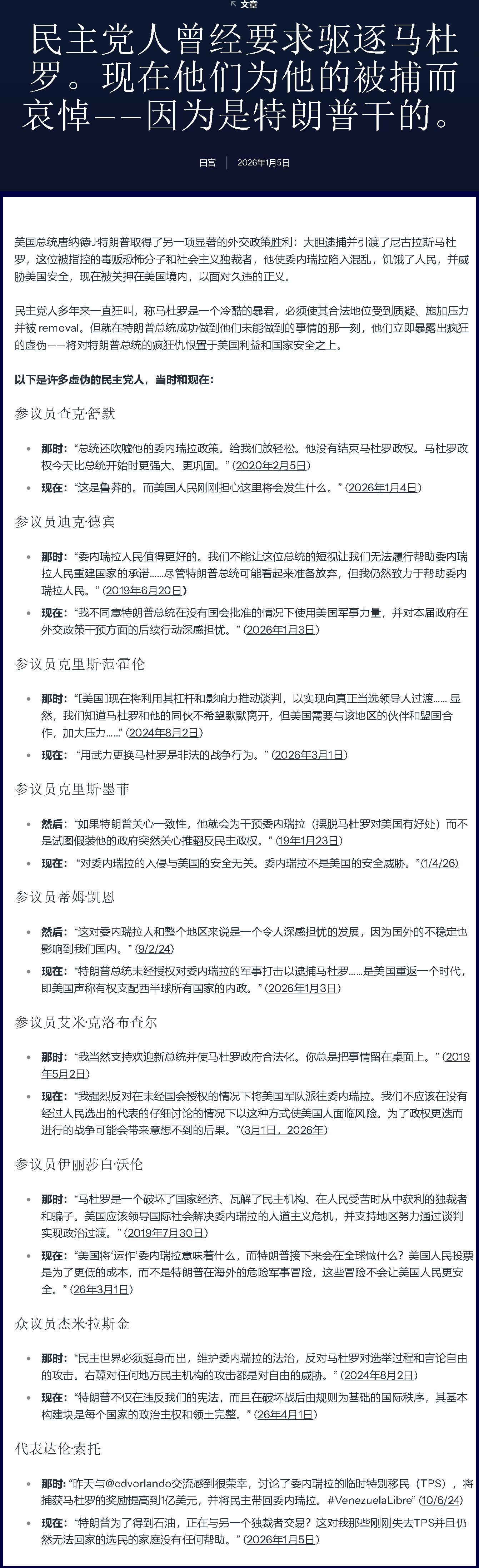 現(xiàn)在:“特朗普總統(tǒng)未經(jīng)授權(quán)對委內(nèi)瑞拉的軍事打擊以逮捕馬杜羅……是美國重返一個(gè)時(shí)代,即美國聲稱有權(quán)支配西半球所有國家的內(nèi)政?!?(2026年1月3日)