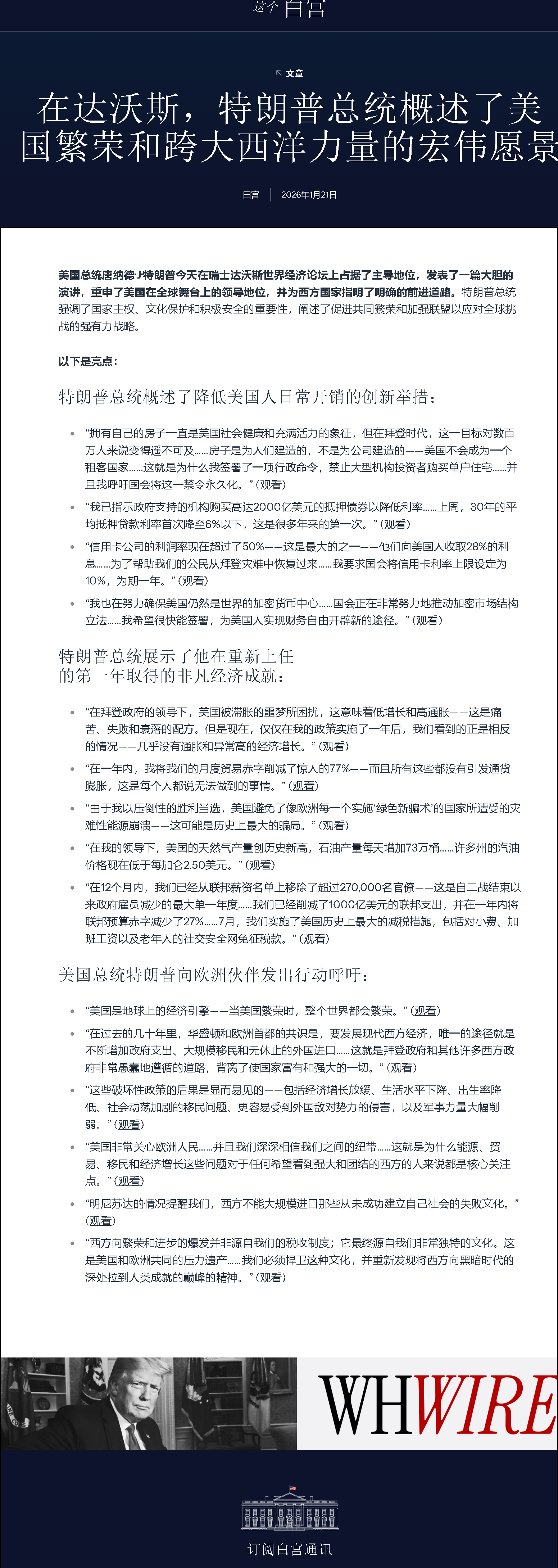 美國(guó)總統(tǒng)唐納德·J·特朗普今天在瑞士達(dá)沃斯世界經(jīng)濟(jì)論壇上占據(jù)了主導(dǎo)地位,發(fā)表了一篇大膽的演講,重申了美國(guó)在全球舞臺(tái)上的領(lǐng)導(dǎo)地位,并為西方國(guó)家指明了明確的前進(jìn)道路。特朗普總統(tǒng)強(qiáng)調(diào)了國(guó)家主權(quán)、文化保護(hù)和積極安全的重要性,闡述了促進(jìn)共同繁榮和加強(qiáng)聯(lián)盟以應(yīng)對(duì)全球挑戰(zhàn)的強(qiáng)有力戰(zhàn)略。