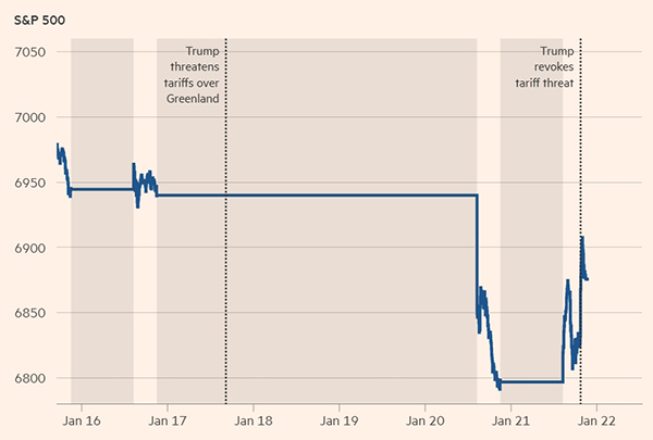 特朗普就格陵蘭問題發(fā)出關稅威脅后,標普500指數變化。 《金融時報》制圖