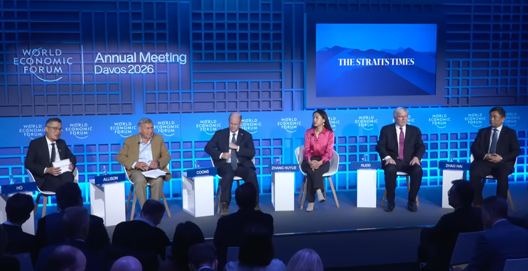 格雷厄姆·艾利森教授(左二)、趙海博士(右一)參加達沃斯論壇的中美關系分論壇,主持人為新加坡《海峽時報》編輯Jaime Ho 視頻截圖