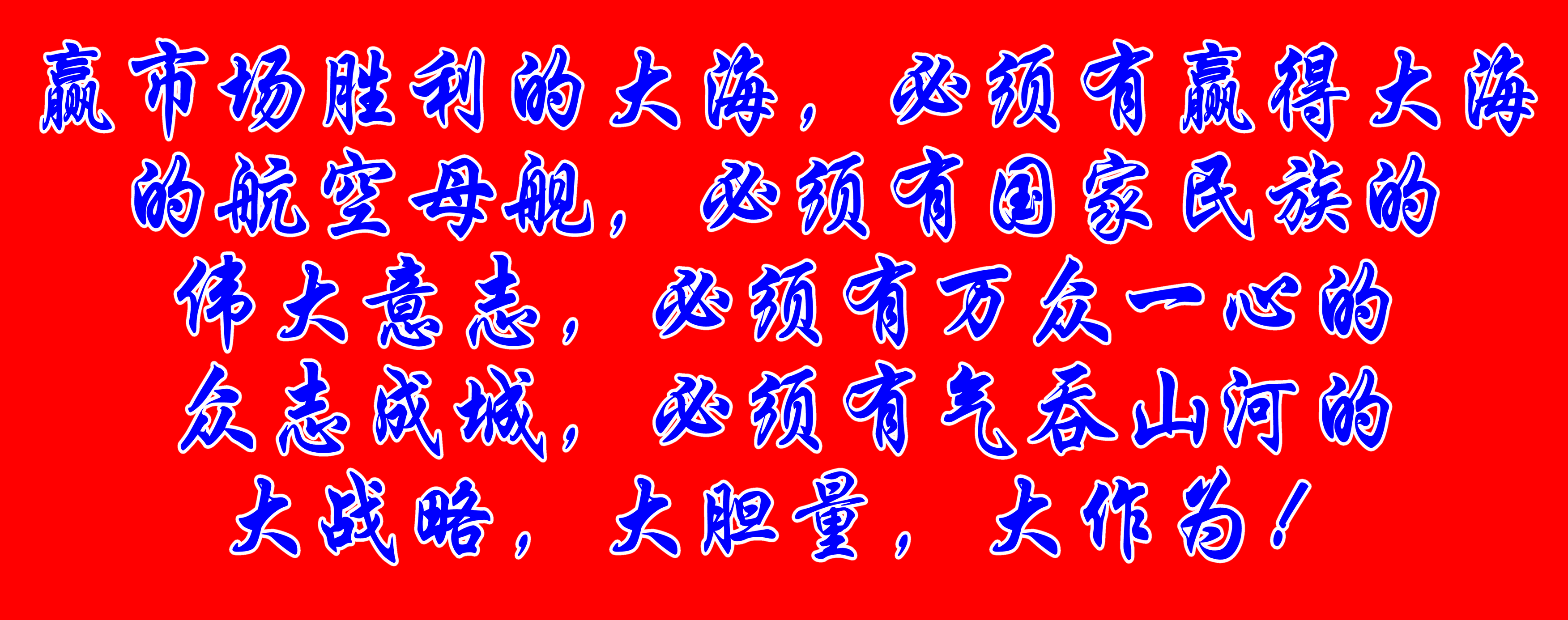 贏市場勝利的大海,必須有贏得大海的航空母艦,必須有國家民族的偉大意志,必須有萬眾一心的眾志成城,必須有氣吞山河的大戰(zhàn)略,大膽量,大作為!