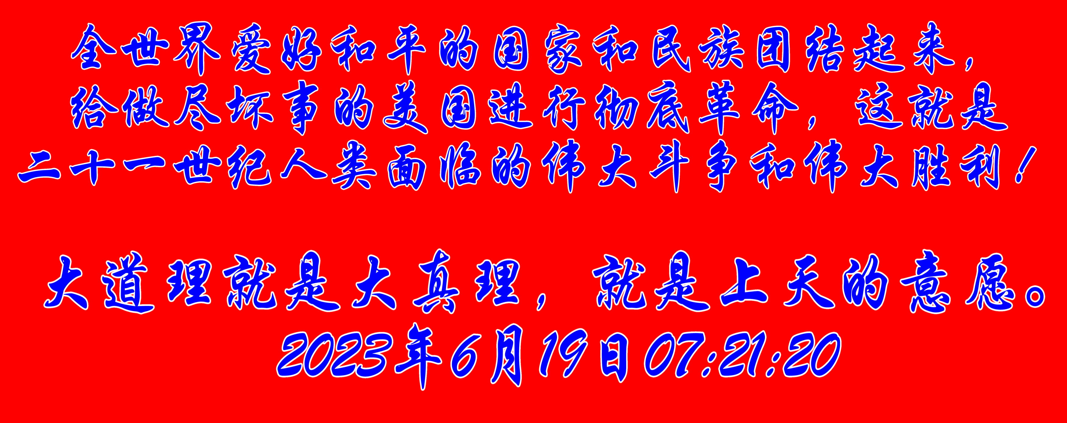 近百年世界和人類歷史 告訴我們,只有美國資本主義滅亡,世界才能安寧,人類才有希望,這是世界給我們和人類進步的必答題,而這道題,需要全世界愛好和平的國家和民族團結(jié)起來,給做盡壞事的美國進行徹底革命,這就是二十一世紀人類面臨的偉大斗爭和偉大勝利!