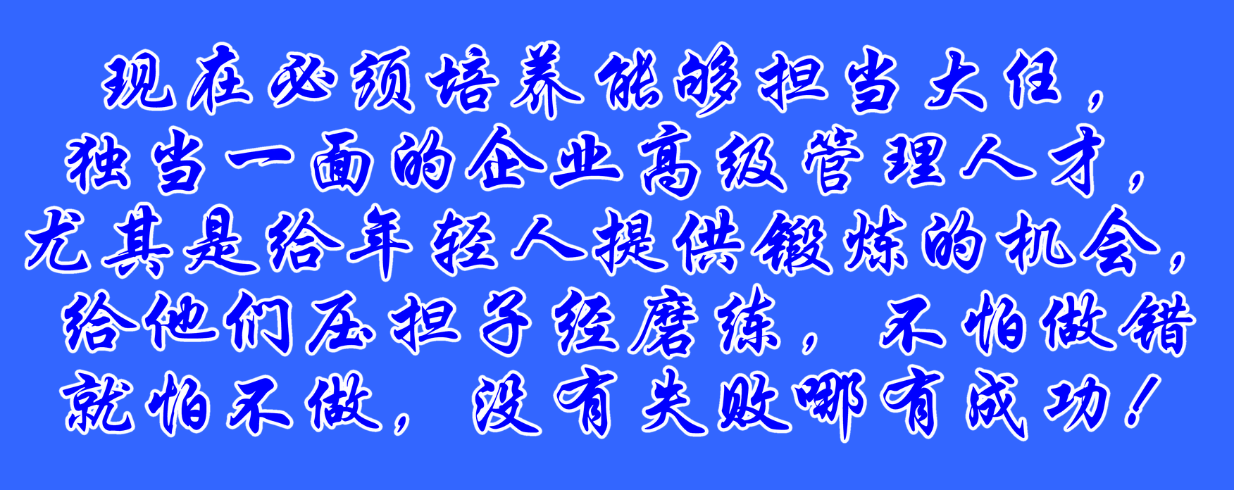 我對公司未來的重要人事,提出了建設性意見,現(xiàn)在必須培養(yǎng)能夠擔當大任,獨當一面的企業(yè)高級管理人才,尤其是給年輕人提供鍛煉的機會,給他們壓擔子經(jīng)磨練,不怕做錯就怕不做,沒有失敗哪有成功!