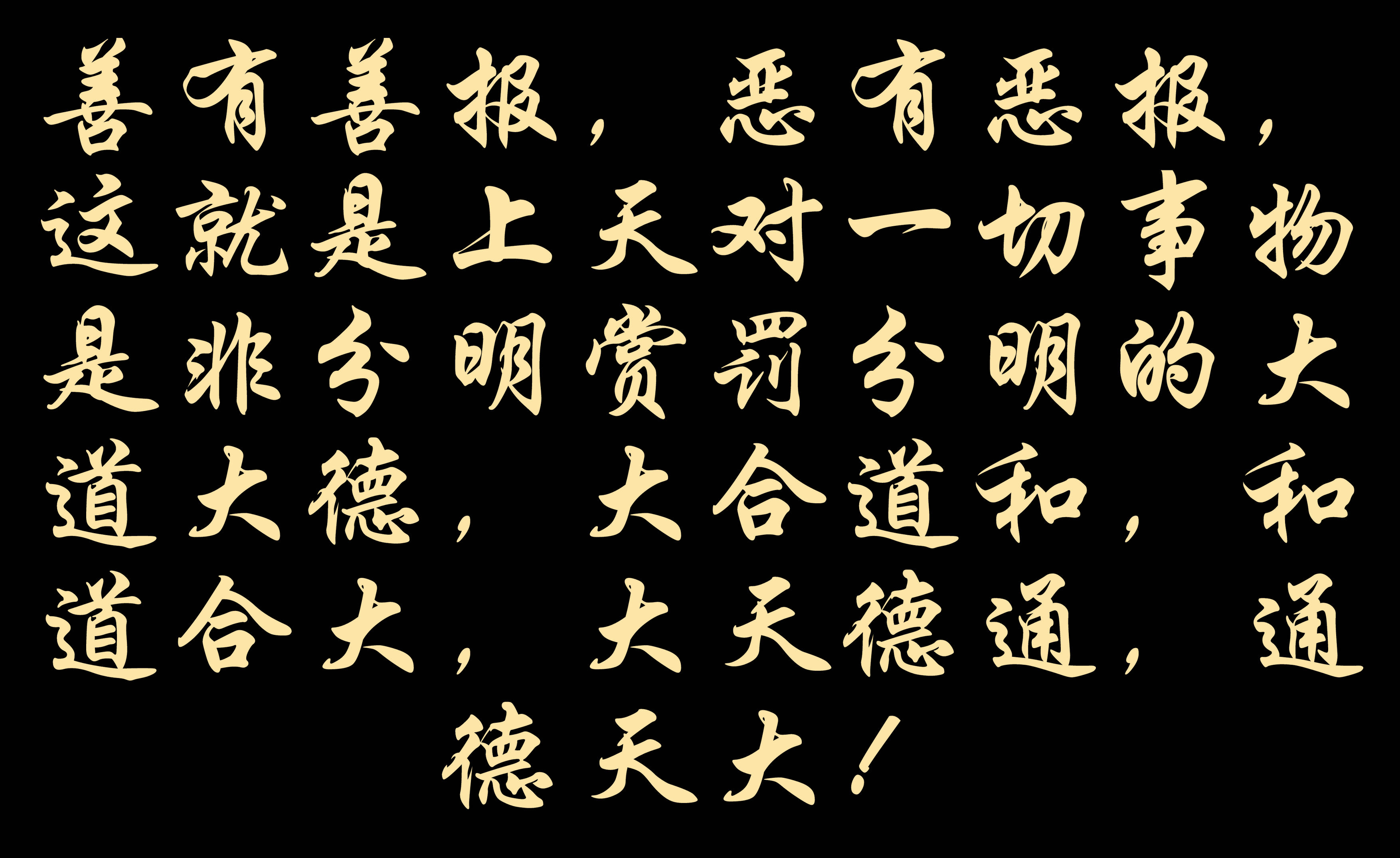 善有善報,惡有惡報,這就是上天對一切事物是非分明賞罰分明的大道大德:大合道和,和道合大,大天德通,通德天大!