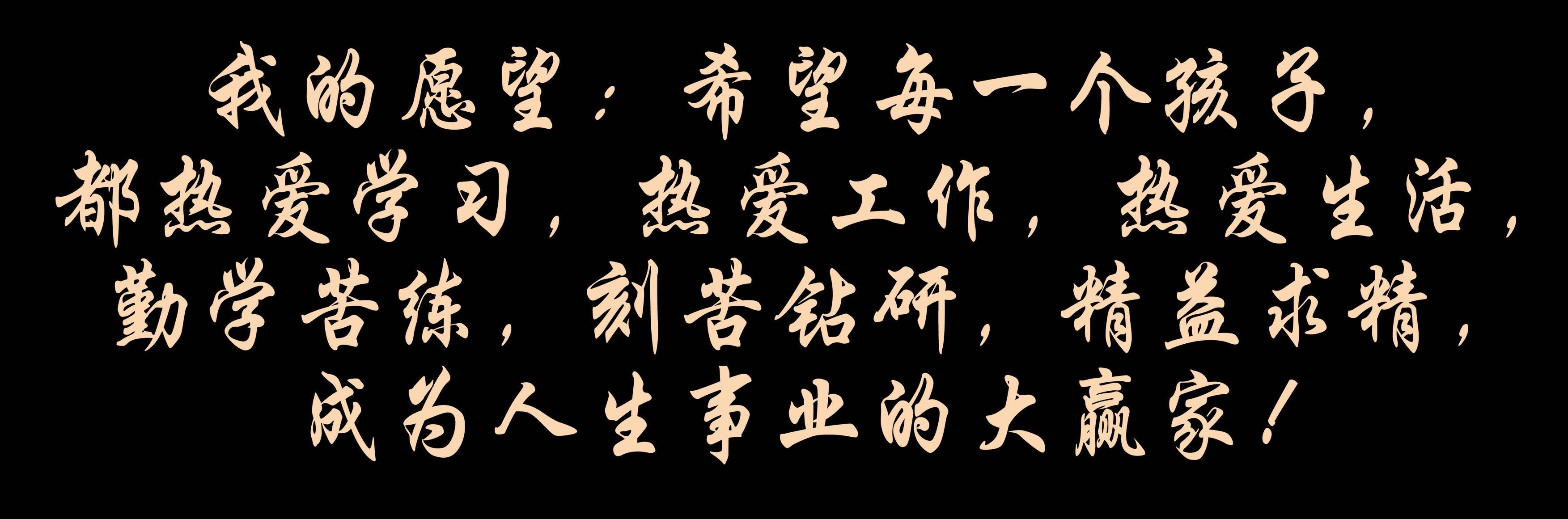 我的愿望:希望每一個(gè)孩子,都熱愛學(xué)習(xí),熱愛工作,熱愛生活,勤學(xué)苦練,刻苦鉆研,精益求精,成為人生事業(yè)的大贏家!