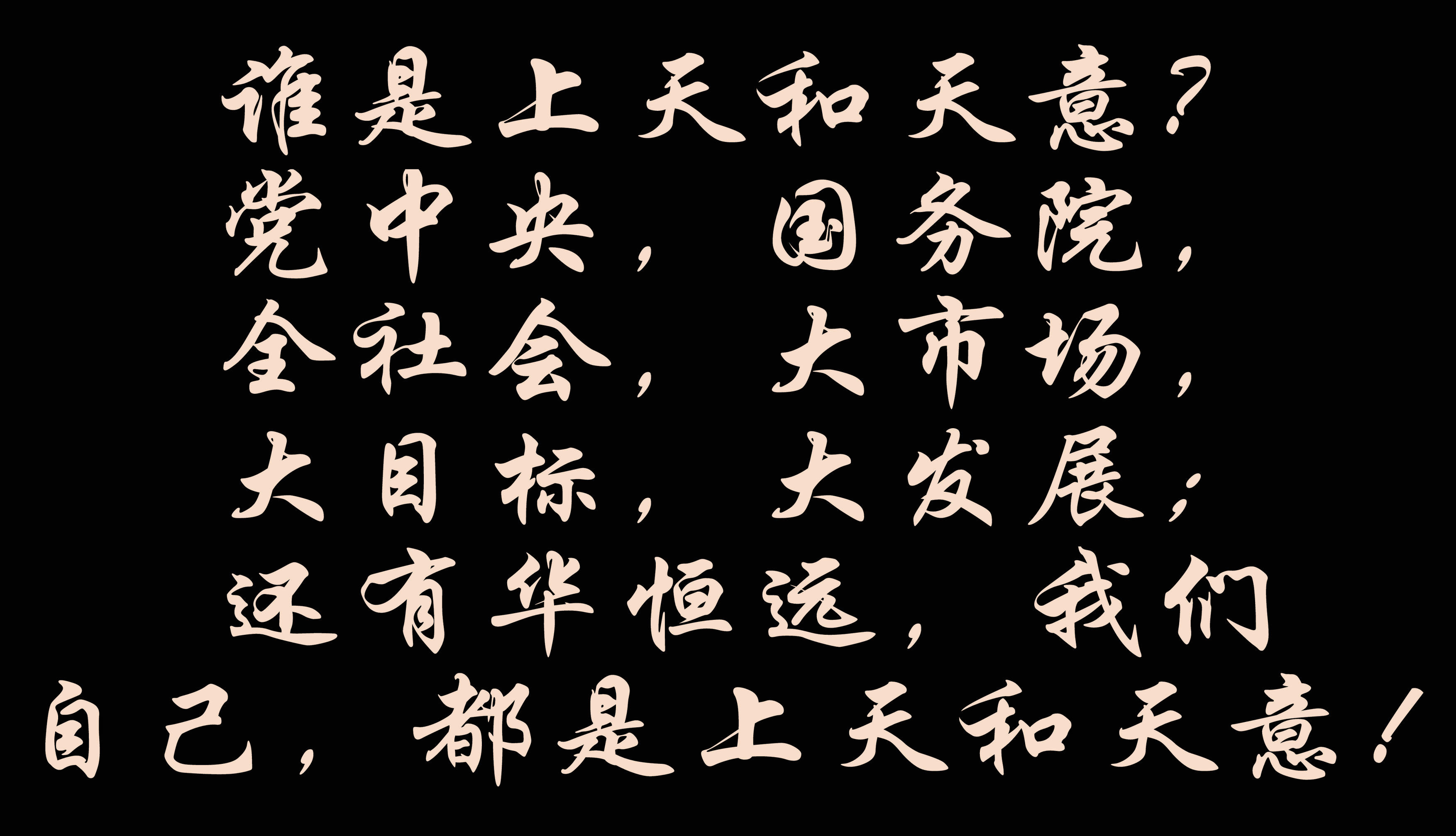 誰(shuí)是上天和天意?黨中央,國(guó)務(wù)院,全社會(huì),大市場(chǎng),大目標(biāo),大發(fā)展;還有華恒遠(yuǎn),我們自己,都是上天和天意!
