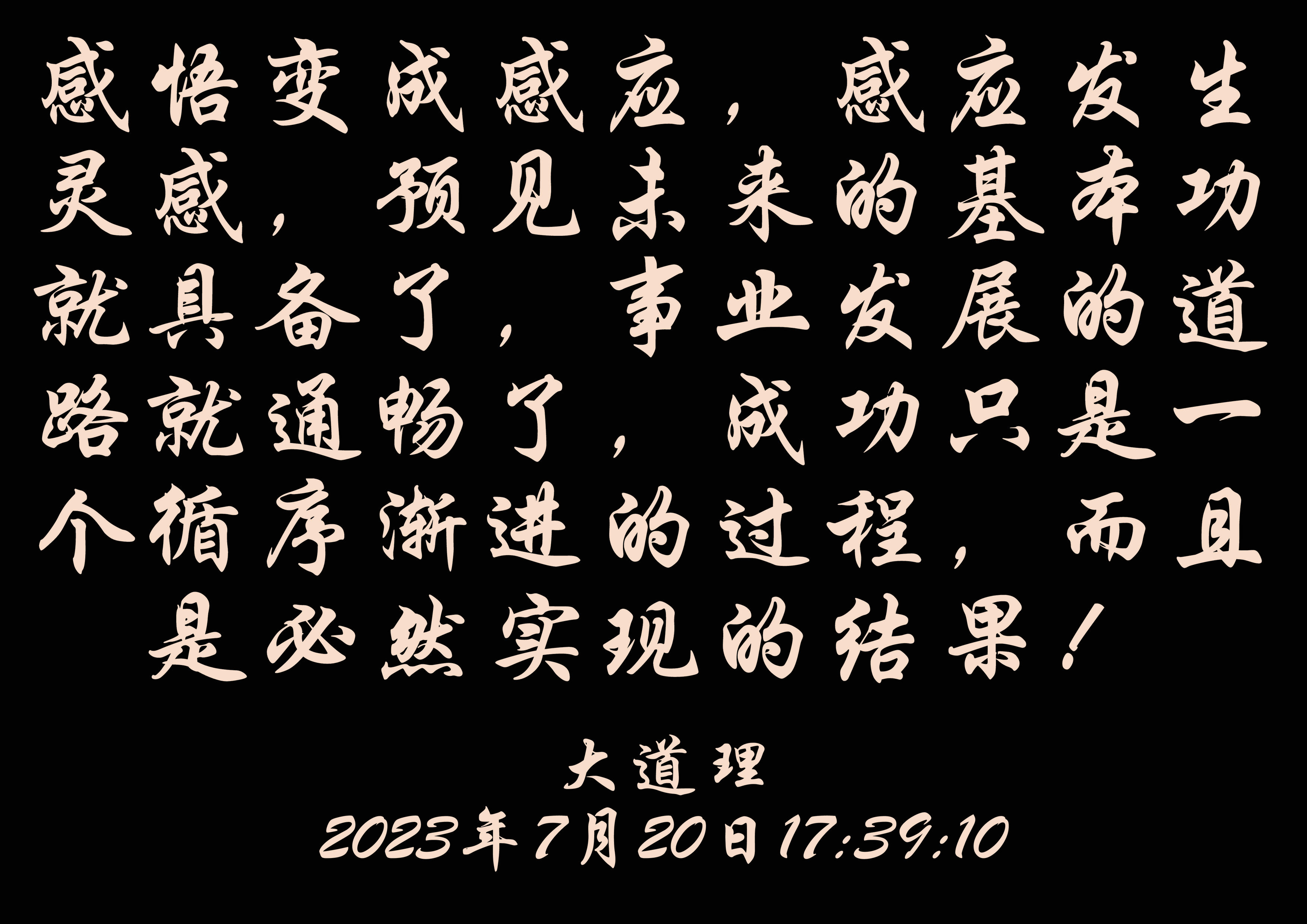 這就是中華文明和中華文化在新時(shí)代改變中國(guó)的第二個(gè)結(jié)合,國(guó)家如此,社會(huì)更是如此。懂得了這個(gè)道理,感悟變成感應(yīng),感應(yīng)發(fā)生靈感,預(yù)見未來(lái)的基本功就具備了,事業(yè)發(fā)展的道路就通暢了,成功只是一個(gè)循序漸進(jìn)的過(guò)程,而且是必然實(shí)現(xiàn)的結(jié)果!